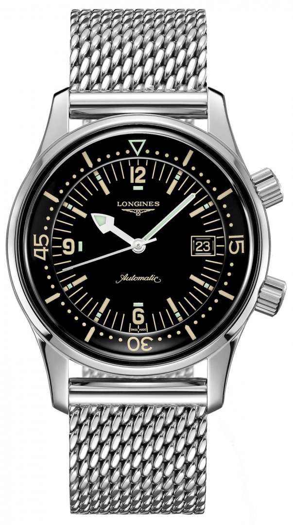 luxury watches Longines Heritage Legend Diver Automat, Water resistance 300M, 42 mm. The watch has functions luminescence and date . Basic parameters of the watch are: dial colour is black, movement type is mechanical watch with automatic winding, strap material is steel and water resistance is 300 m.