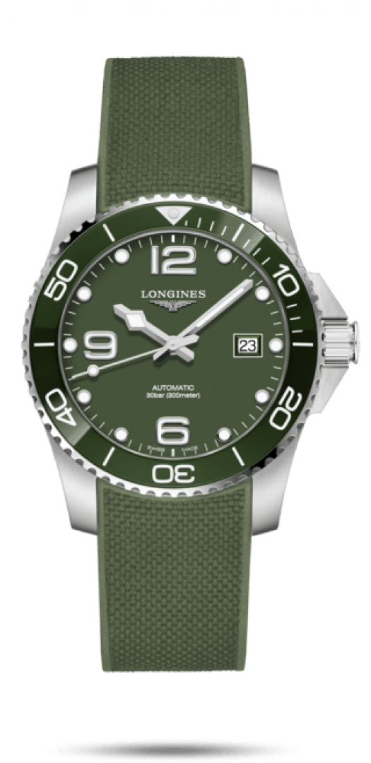 Luxury watches Longines HydroConquest Water resistance 300M, Automatic, 41 mm. The watch has functions luminescence and date . Basic parameters of the watch are: water resistance is 300 m, movement type is mechanical watch with automatic winding, strap material is rubber and dial colour is green.