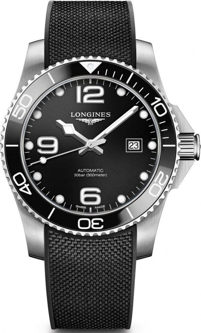 Luxury watches Longines HydroConquest . The watch has functions luminescence and date . Basic parameters of the watch are: water resistent is 300 m, movement type is mechanical watch with automatic winding, strap material is rubber and dial colour is black.