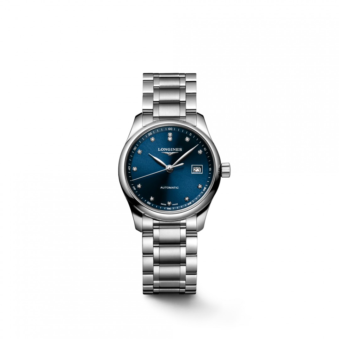 luxury watches Longines Master Collection Diamonds, Automatic, 34 mm. The watch has functions date . Basic parameters of the watch are: movement type is mechanical watch with automatic winding, water resistance is 30 m, dial colour is blue and strap material is steel.