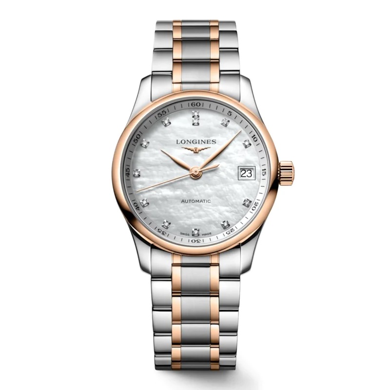 luxury watches Longines Master Collection Diamonds, Automatic, 34 mm. The watch has functions date . Basic parameters of the watch are: movement type is mechanical watch with automatic winding, water resistance is 30 m, strap material is steel and dial colour is pearl.