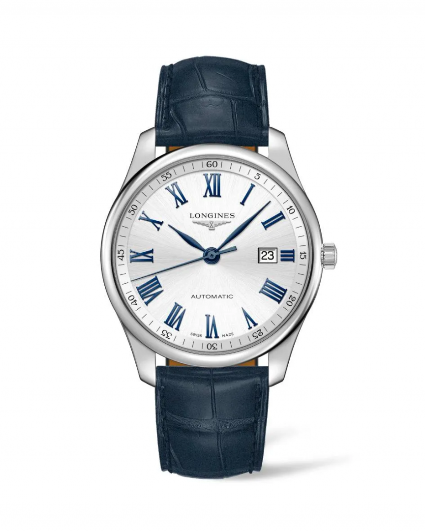 luxury watches Longines Master Collection Automatic, 42 mm. The watch has functions date . Basic parameters of the watch are: dial colour is silver, movement type is mechanical watch with automatic winding, strap material is leather and water resistance is 30 m.