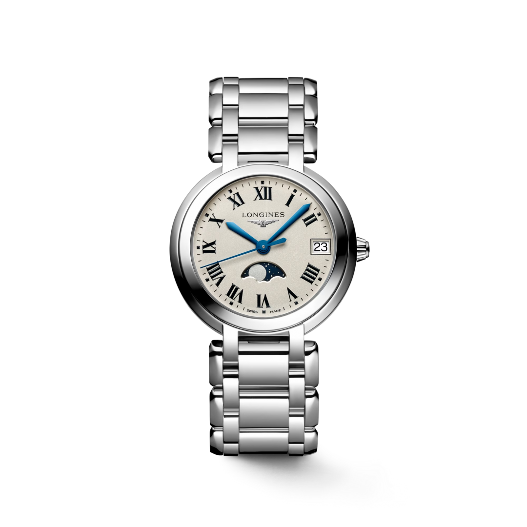 Ladies luxury watches Longines PrimaLuna 34mm Quartz steel case with steel buckle. The watch has functions date and moon phases. Basic parameters of the watch are: water resistance is 30 m, movement type is Quartz watches, bracelet is steel and dial colour is blue.