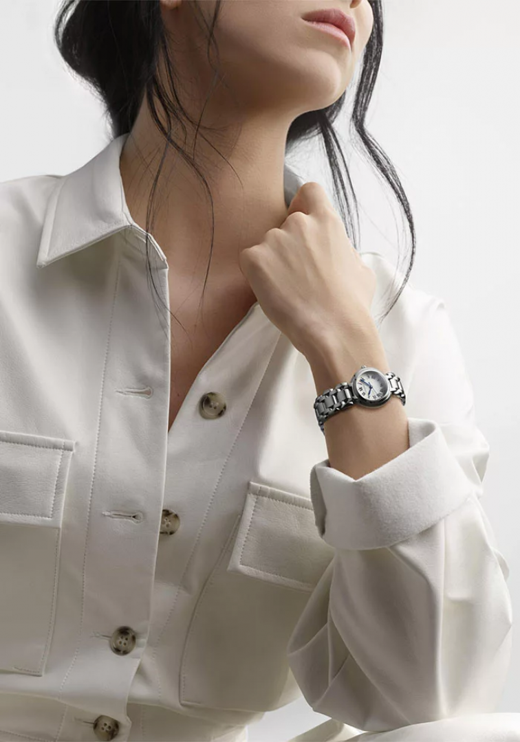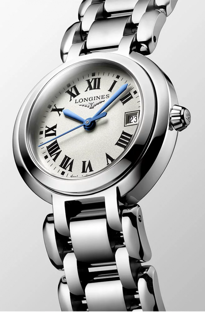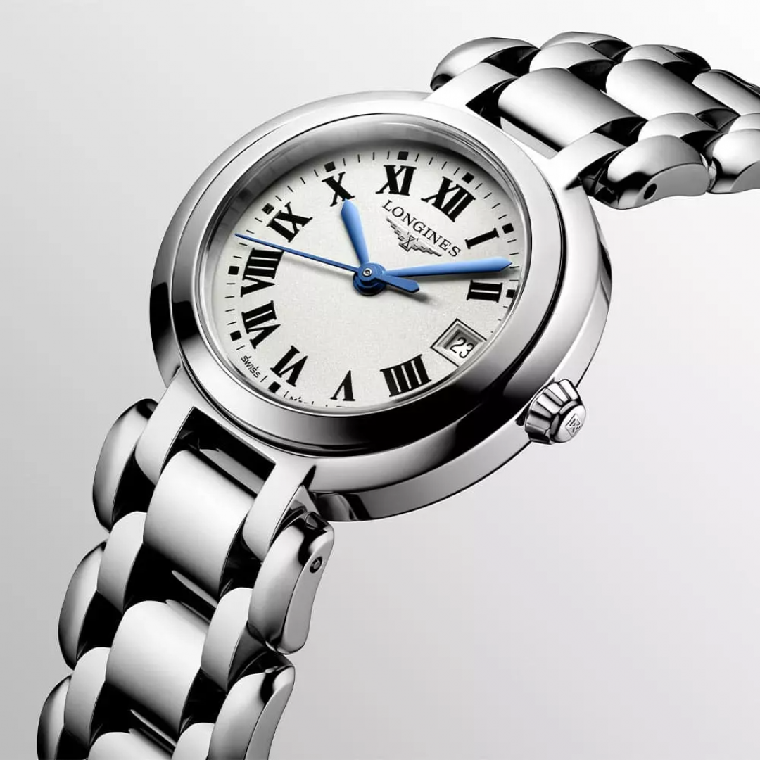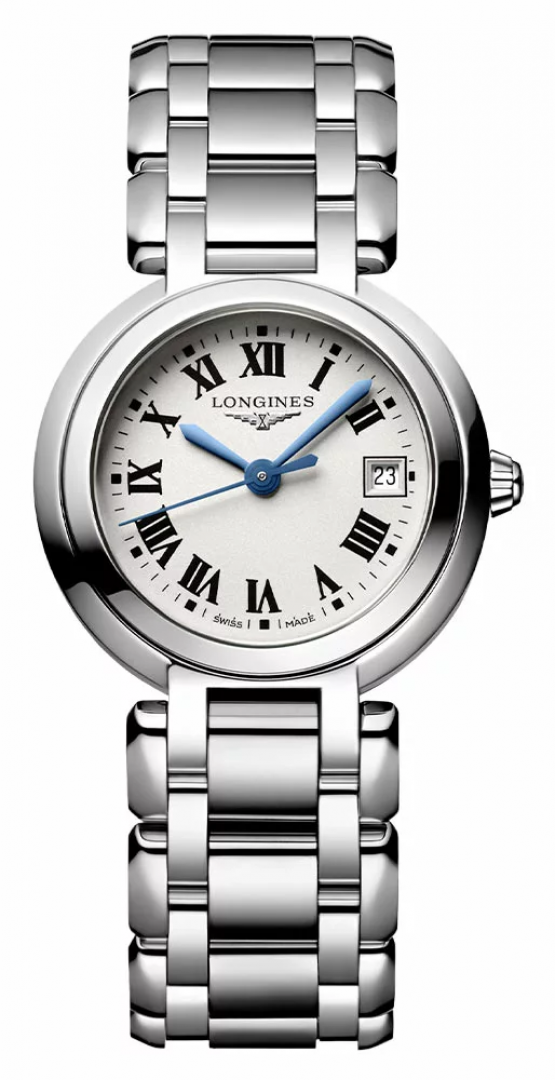 Ladies luxury watches Longines PrimaLuna 26.50mm steel case with steel buckle. The watch has functions date . Basic parameters of the watch are: water resistance is 30 m, movement type is Quartz watches, bracelet is steel and dial colour is white.