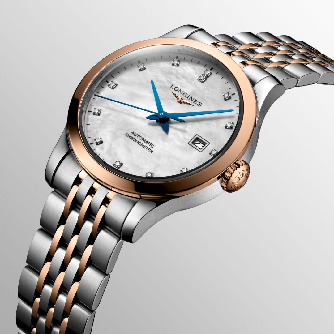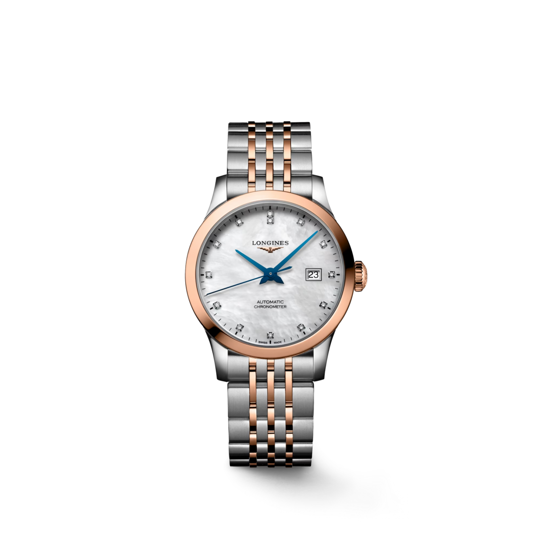 Ladies luxury watches Longines Record 30mm automatic steel gold case and buckle. The watch has functions date. Basic parameters of the watch are: dial colour is pearl, movement type is mechanical watch with automatic winding, bracelet is steel and arany and water resistance is 30 m.
