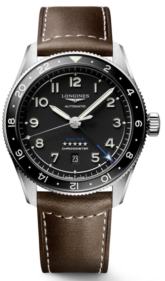 luxury watches Longines Spirit Zulu Time GMT, Automatic, Water resist. 100M, 42 mm. The watch has functions dual time, luminescence and date . Basic parameters of the watch are: dial colour is black, movement type is mechanical watch with automatic winding, strap material is leather and water resistance is 100 m.