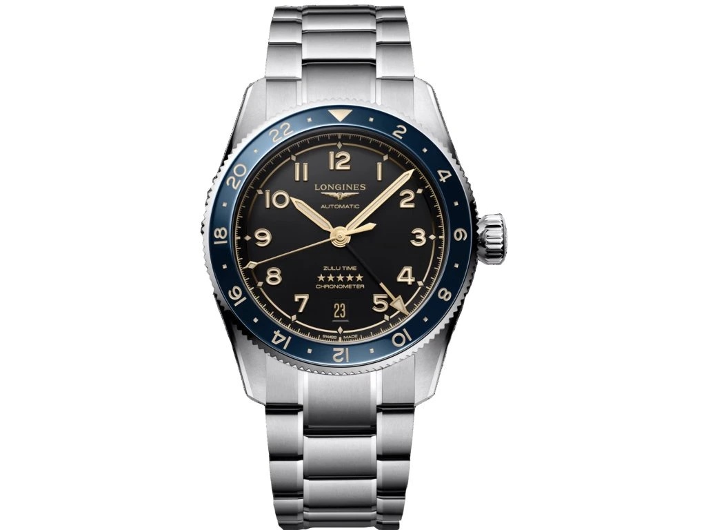 luxury watches Longines Spirit Zulu Time GMT, Automatic, Water resist. 100M, 42 mm. The watch has functions dual time, luminescence and date . Basic parameters of the watch are: dial colour is black, movement type is mechanical watch with automatic winding, water resistance is 100 m and strap material is steel.