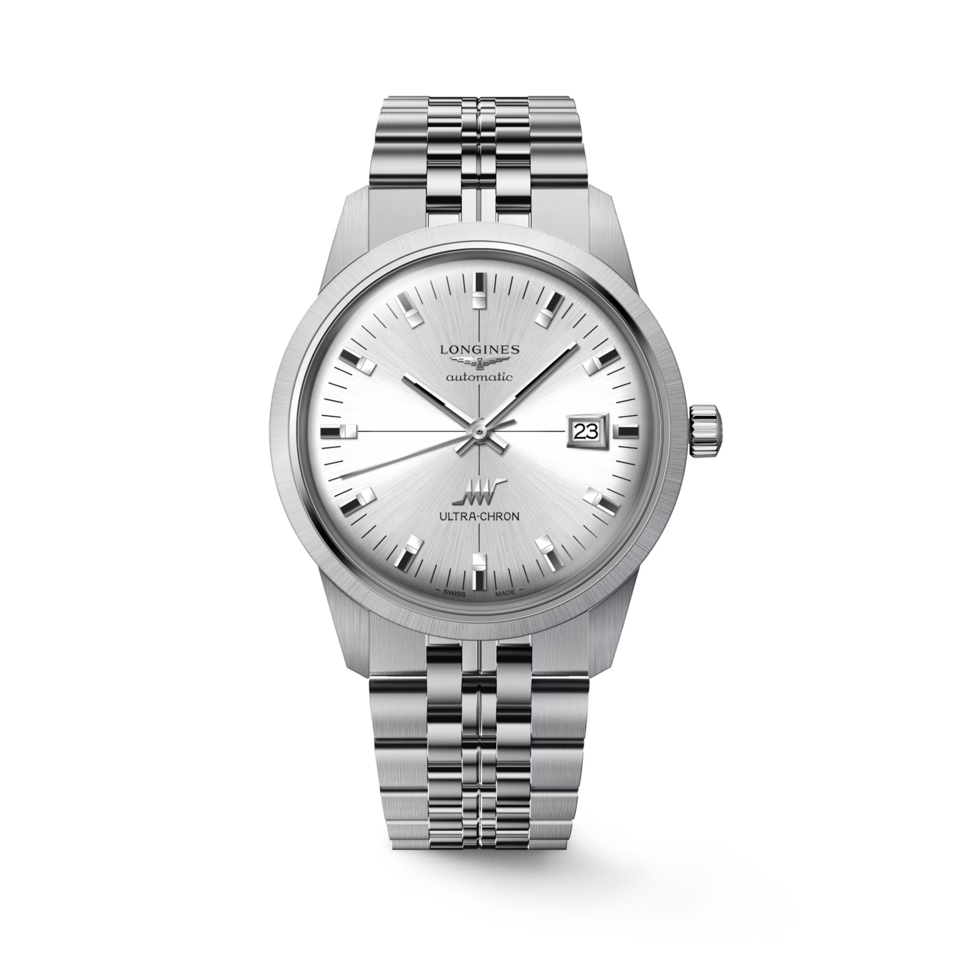 The Ultra-Chron model is equipped with an automatic movement that ticks at a frequency of 36,000 vibrations per hour (5 Hz). This high frequency ensures exceptional accuracy and better resistance to shocks and external influences. Longines builds on more than 100 years of experience in manufacturing high-frequency timepieces, which were originally developed for professional sports timekeeping.