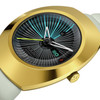 The watch strap is also unusual: the cushion shape made of gray rubber is unconventional and futuristic. The wearer can fasten the watch with a dark gray PVD-coated stainless steel buckle, which also features gold-colored decorations found on the watch case. The watch's buckle and push buttons were also designed by Tej Chauhan.