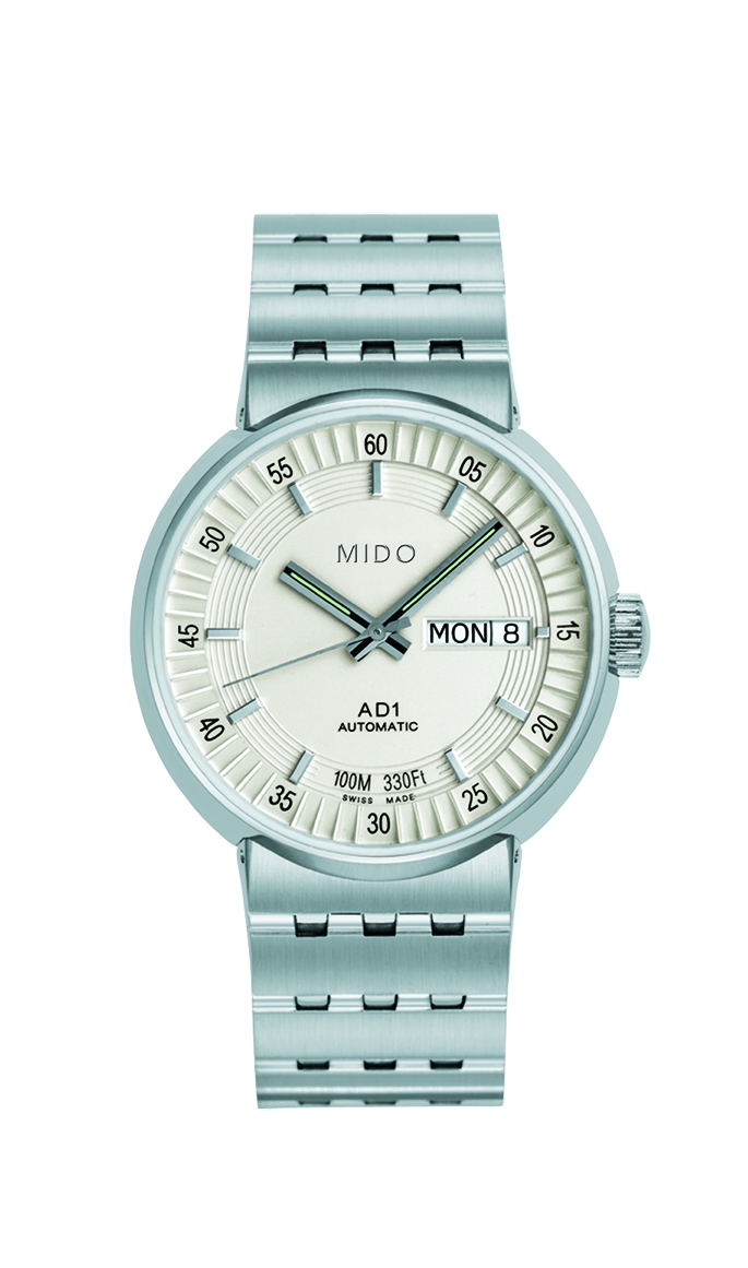 Swiss watches Mido All Dial . The watch has functions date and Day-Date. Basic parameters of the watch are: dial colour is white, bracelet is steel and water resistance is 100 m.