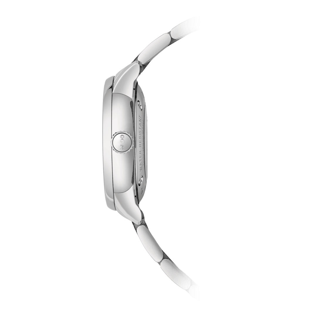 Ladies luxury watches Mido Baroncelli Signature Lady 30mm stainless steel case with steel buckle. The watch has functions date. Basic parameters of the watch are: dial colour is white, movement type is mechanical watch with automatic winding, bracelet is leather and water resistance is 30 m.