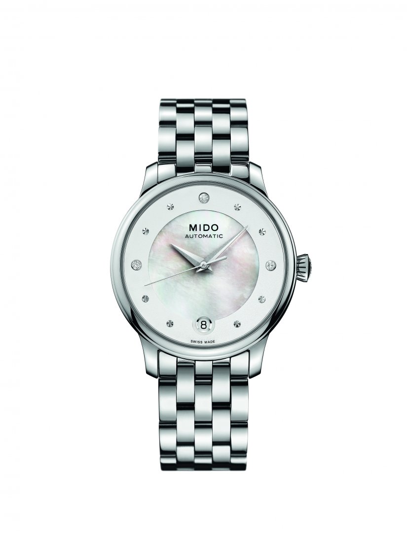 Swiss watches Mido Baroncelli Lady Day . The watch has functions date. Basic parameters of the watch are: dial colour is white and pearl, movement type is mechanical watch with automatic winding, bracelet is steel and water resistance is 50 m.