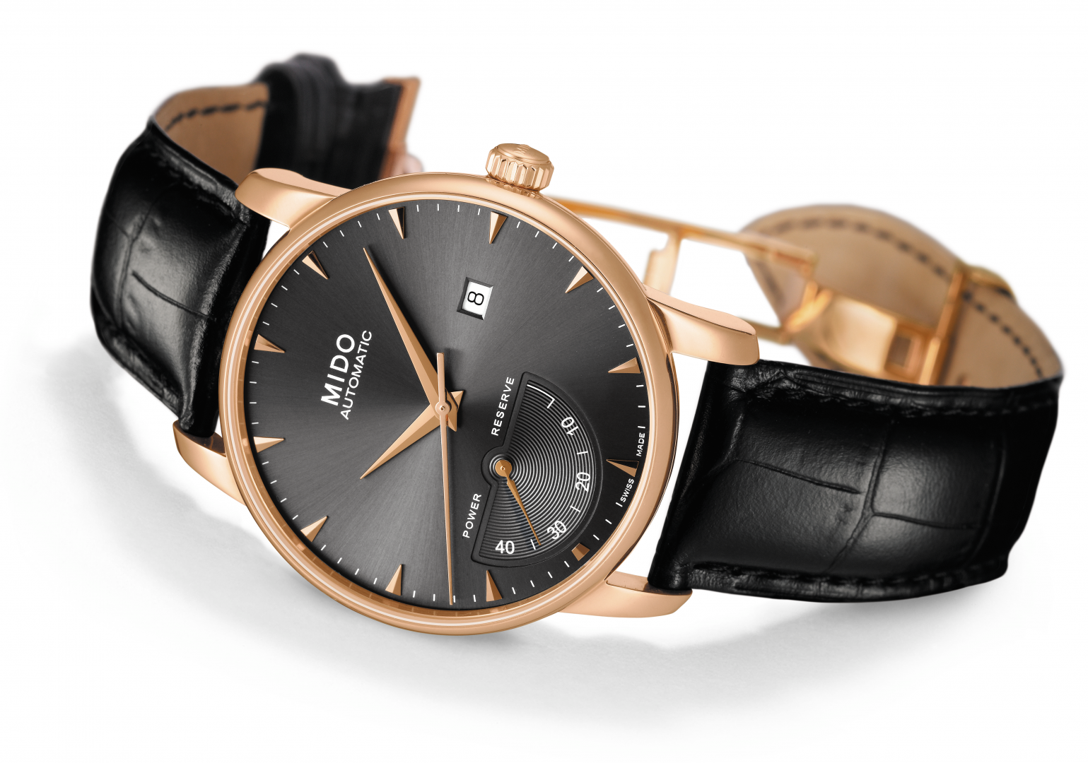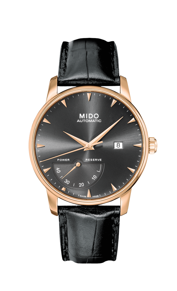 Luxury watches Mido Baroncelli Power Reserve Automat, 42 mm. The watch has functions date and power reserve. Basic parameters of the watch are: dial colour is grey, movement type is mechanical watch with automatic winding, strap material is leather and water resistance is 50 m.