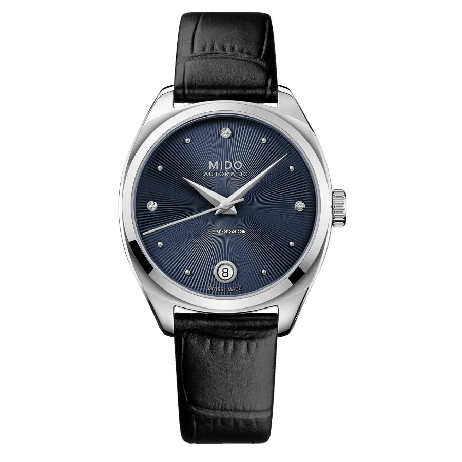 Luxury watches Mido Belluna Royal Lady Diamanty, Automat, 33 mm. The watch has functions date . Basic parameters of the watch are: movement type is mechanical watch with automatic winding, water resistance is 30 m, dial colour is blue and strap material is leather.