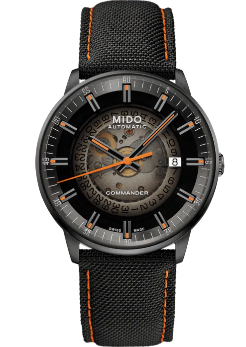 swiss watches Mido Commander Gradient Automat, 40 mm. The watch has functions luminescence and date . Basic parameters of the watch are: dial colour is black and transparent, movement type is mechanical watch with automatic winding, strap material is textiles and water resistance is 50 m.
