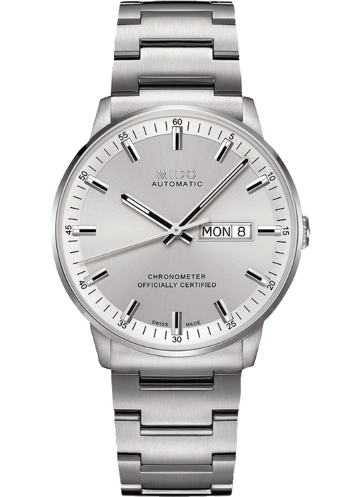 Luxury watches Mido Commander Chronometer . The watch has functions date and luminescence. Basic parameters of the watch are: movement type is mechanical watch with automatic winding, water resistent is 50 m, strap material is steel and dial colour is silver.