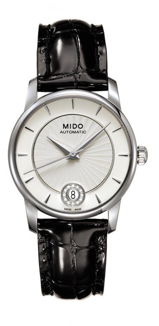 Luxury watches Mido Baroncelli Diamonds . The watch has functions date. Basic parameters of the watch are: dial colour is silver, bracelet is leather and water resistance is 50 m.