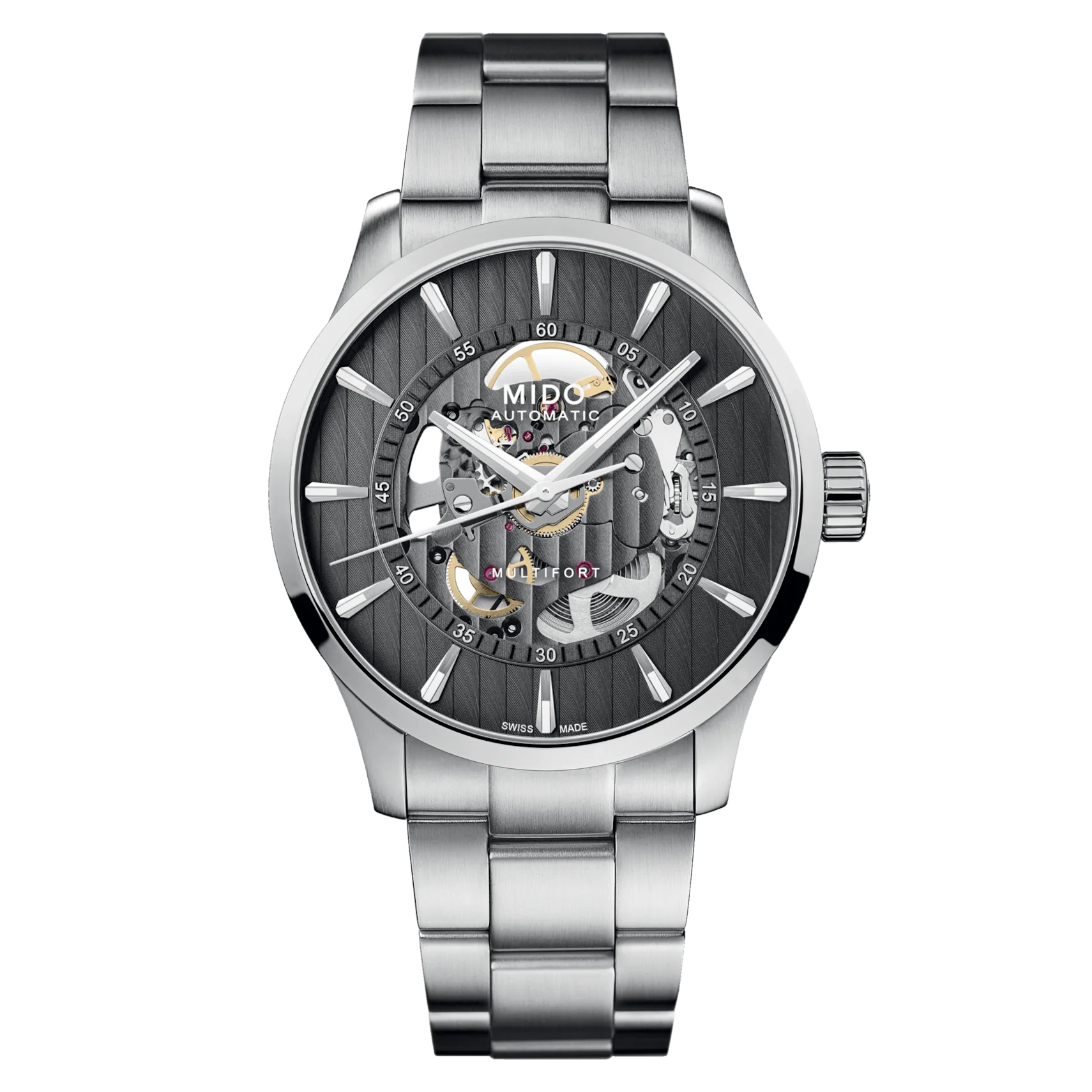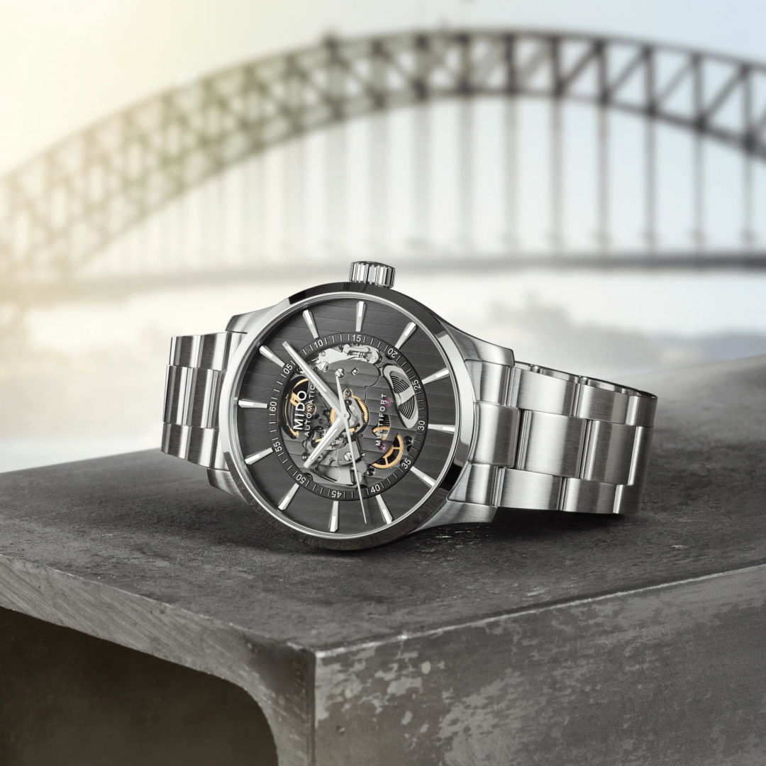 With its assertive aesthetics and visible mechanism, the Multifort Skeleton Vertigo Swiss Watch takes a bold stance. In a true stylistic and technological achievement, MIDO showcases the heart of its automatic movement by revealing its finely skeletonised plate. The sporty timepiece shows a strong architectural influence – a characteristic of this collection inspired by the Sydney Harbour Bridge – with Geneva stripes adorning its unique face. Inside its robust steel exterior, the ultra-resistant Caliber 80, fitted with a Nivachron™ balance-spring, proudly displays its geartrain. Its exceptional autonomy lasts for up to 80 hours, promising ultimate accuracy for conquering the city without stopping.