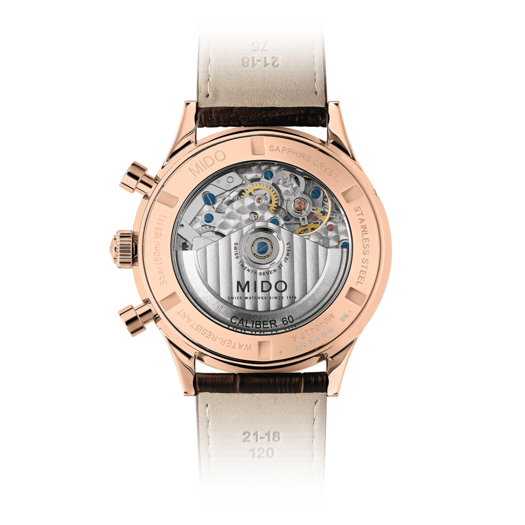 The MIDO Caliber 60 is a self-winding chronograph movement at the cutting edge of watchmaking technology. It boasts a power reserve of up to 60 hours, exceeding the usual 48 hours of a standard version.