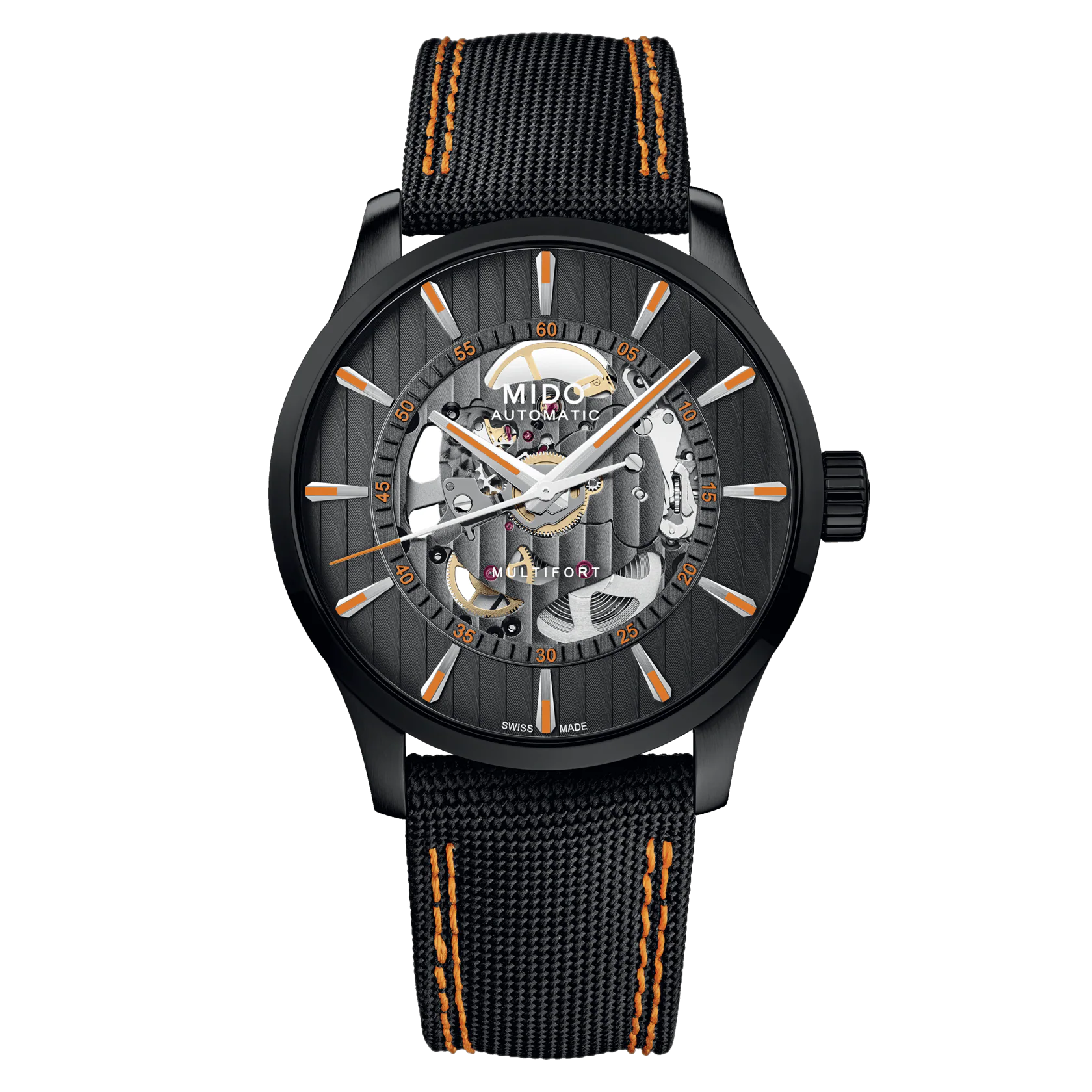 luxury watches Mido Multifort Skeleton Vertigo Automat, 42 mm. The watch has functions luminescence. Basic parameters of the watch are: movement type is mechanical watch with automatic winding, water resistance is 100 m, dial colour is black and transparent and strap material is textiles.