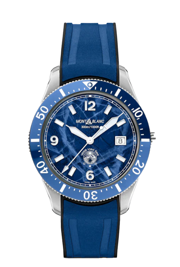 luxury watches Montblanc 1858 Iced Sea Automatic, Water resistance 300M, 41 mm. The watch has functions luminescence and date . Basic parameters of the watch are: dial colour is blue, movement type is mechanical watch with automatic winding, water resistance is 300 m and strap material is rubber.