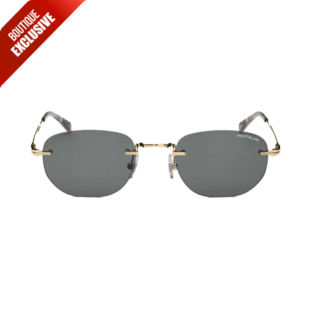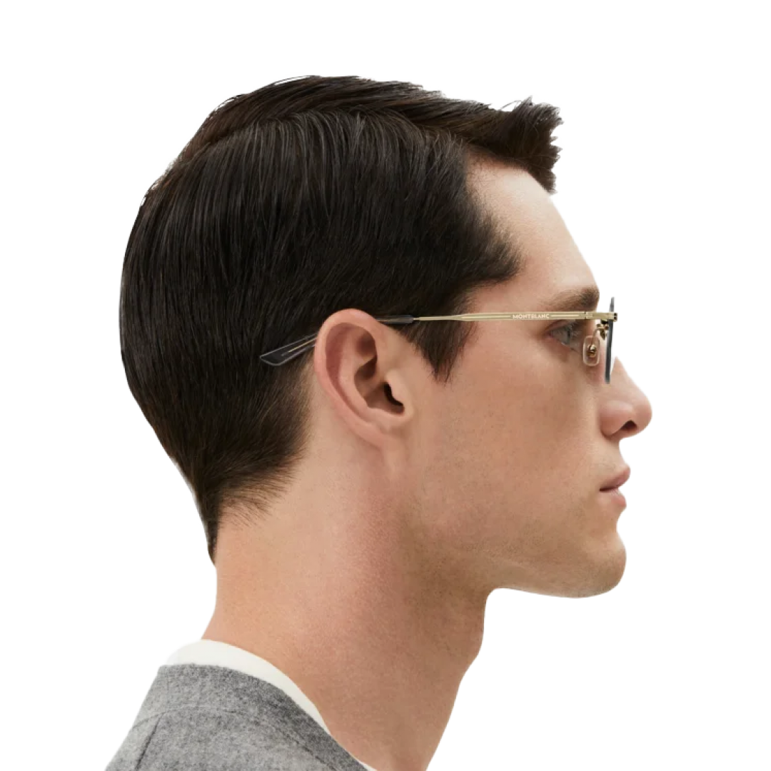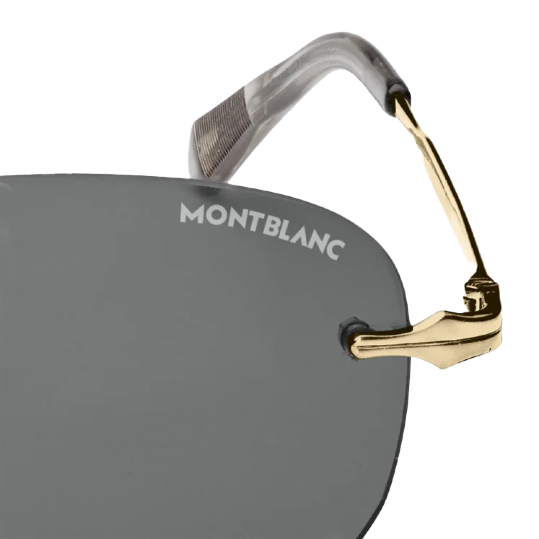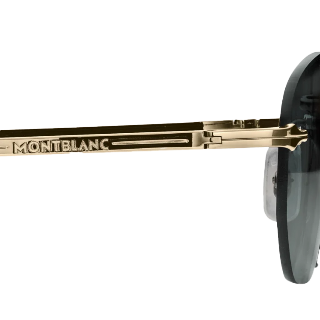 These rectangular sunglasses feature a gold-colored metal frame and black lenses. Inspired by the nib design of the writing instruments, a decorative nib detail is featured on the metal temple design. The Montblanc one line logo is engraved on the right side of the temple, additionally the logo is lasered on the left lens and the anti-slip pattern is lasered onto the internal side of the temple tips to increase comfort.