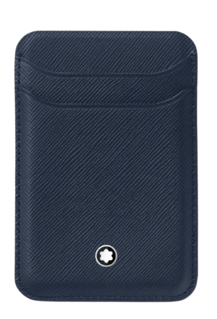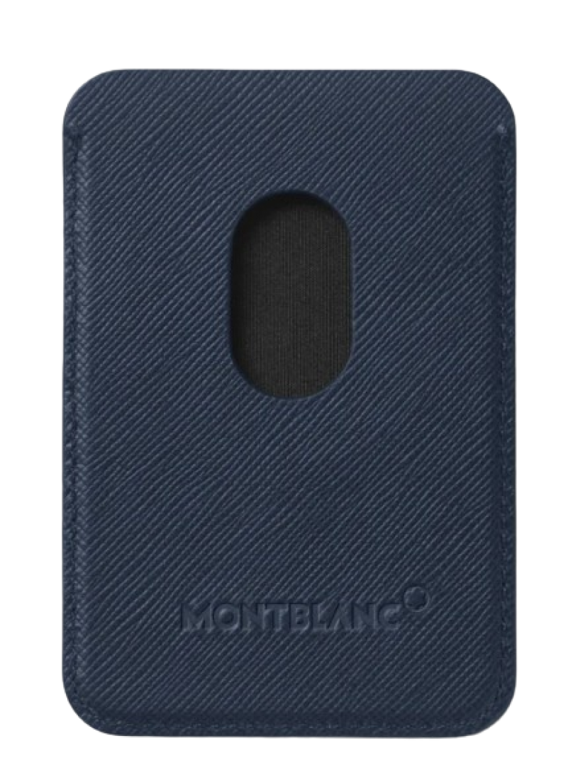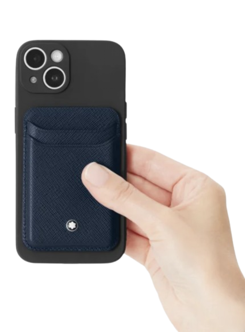 This Apple MagSafe-compatible smart leather wallet in ink blue can magnetically be attached to your phone or cover. Its compact rectangular design features rounded corners for a contemporary aesthetic. Key details include the Montblanc emblem and dedicated slots that accommodate two credit cards.