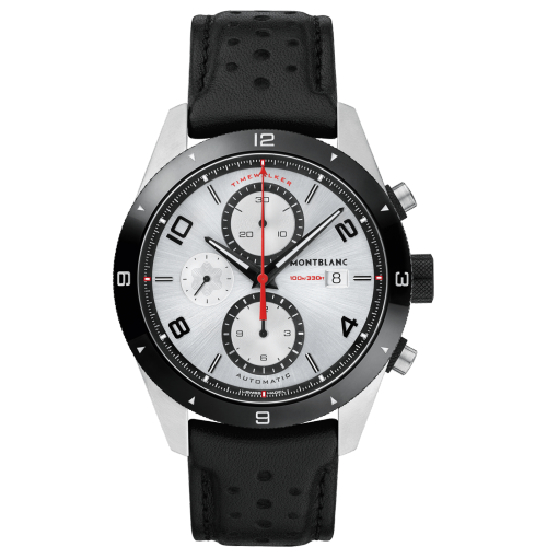 Luxury watches Mont Blanc TimeWalker Automatic, Chronograph, Water resistance 100M, 43 mm. The watch has functions luminescence, stopwatch and date . Basic parameters of the watch are: dial colour is silver, movement type is mechanical chronograph with automatic winding, strap material is leather and water resistent is 100 m.