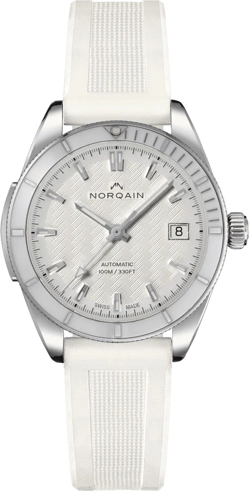 luxury watches Norquain ADVENTURE SPORT 37MM Automatic, Water resistance 100M. The watch has functions luminescence and date . Basic parameters of the watch are: movement type is mechanical watch with automatic winding, water resistance is 100 m, dial colour is silver and strap material is rubber.