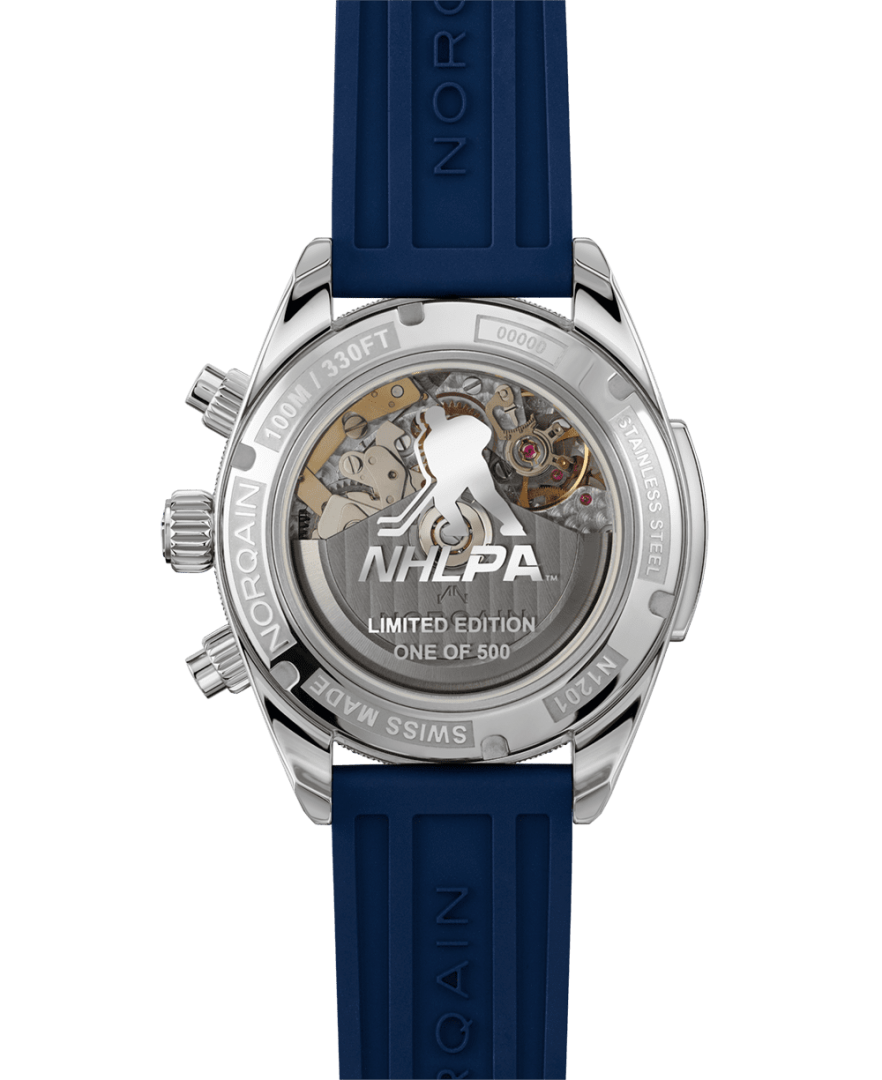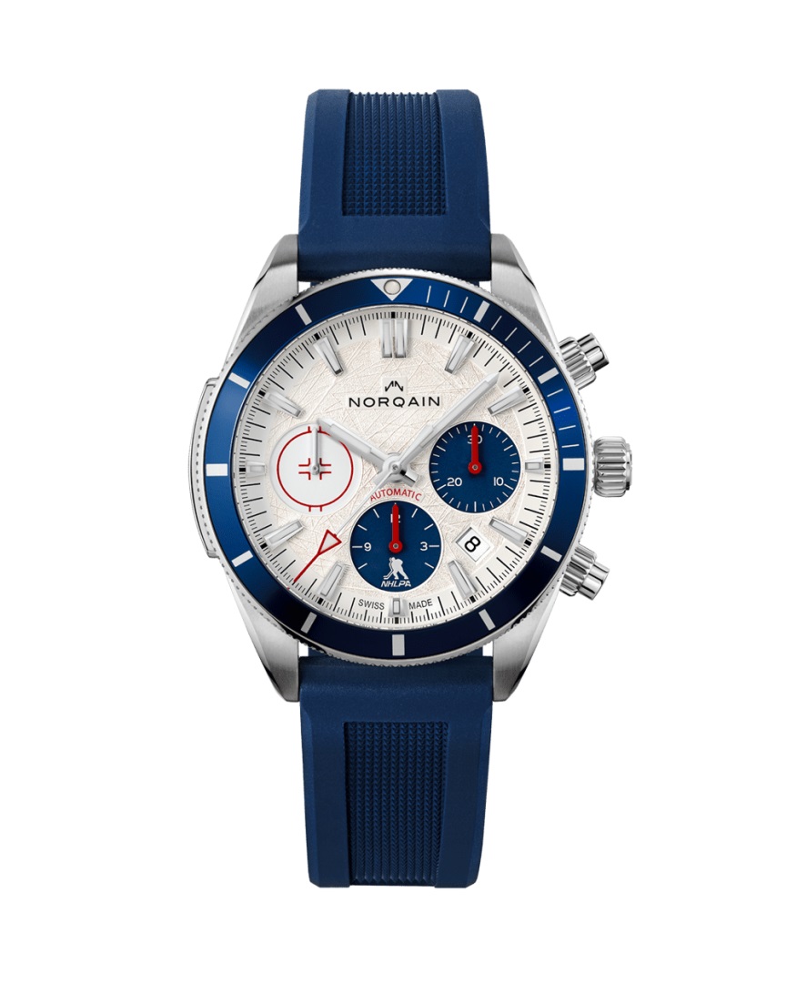 luxury watches Norqain ADVENTURE Sport Chrono NHLPA Automatic Chronograph, Water resist. 100M, 44 mm. The watch has functions luminescence, stopwatch and date . Basic parameters of the watch are: movement type is mechanical chronograph with automatic winding, strap material is rubber, water resistance is 100 m and dial colour is white.