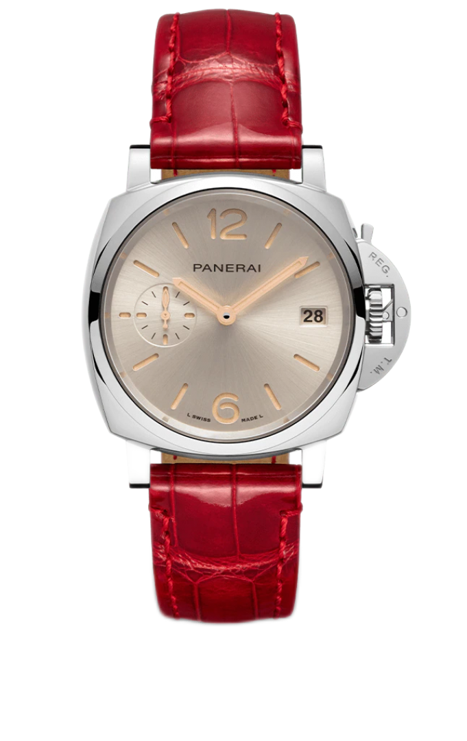 luxury watches Panerai Luminor Due In-house calibre, 38 mm. The watch has functions luminescence and date . Basic parameters of the watch are: movement type is mechanical watch with automatic winding, strap material is leather, water resistance is 30 m and dial colour is beige.