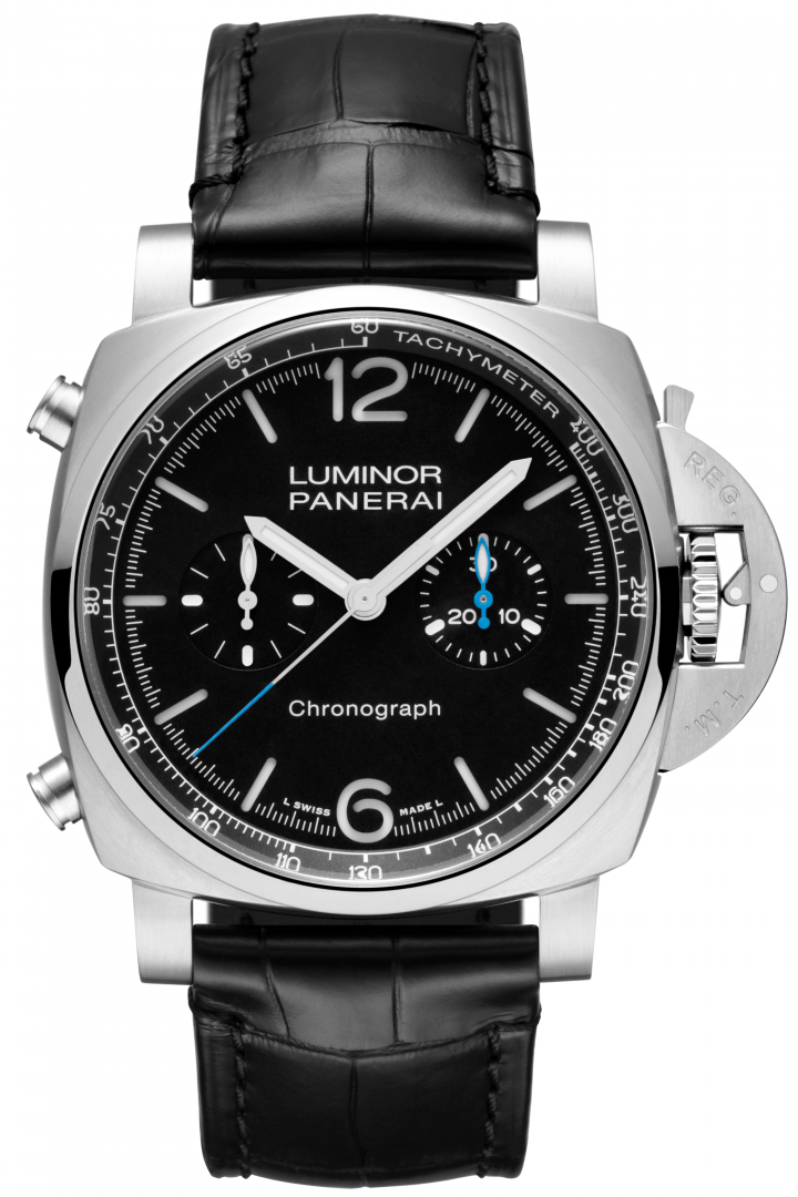 luxury watches Panerai Luminor Chrono Automat Chronograph, Water resistance 100M, 44 mm. The watch has functions luminescence, stopwatch and Tachymeter scale. Basic parameters of the watch are: dial colour is black, movement type is mechanical chronograph with automatic winding, strap material is leather and water resistance is 100 m.