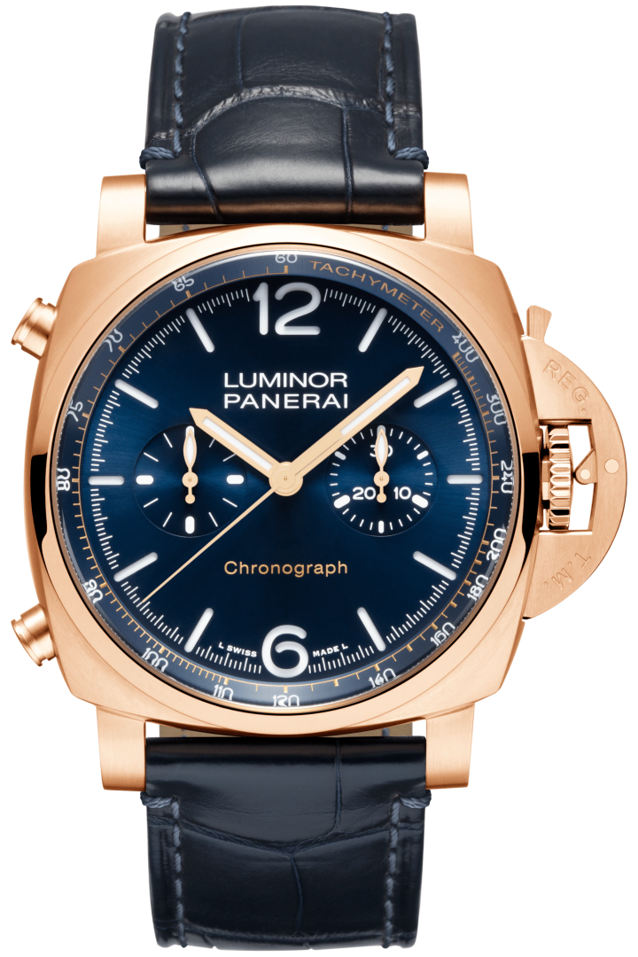 Men's luxury watches Panerai Luminor Chrono Goldtech™ Blu Notte 44mm gold case with leather strap.