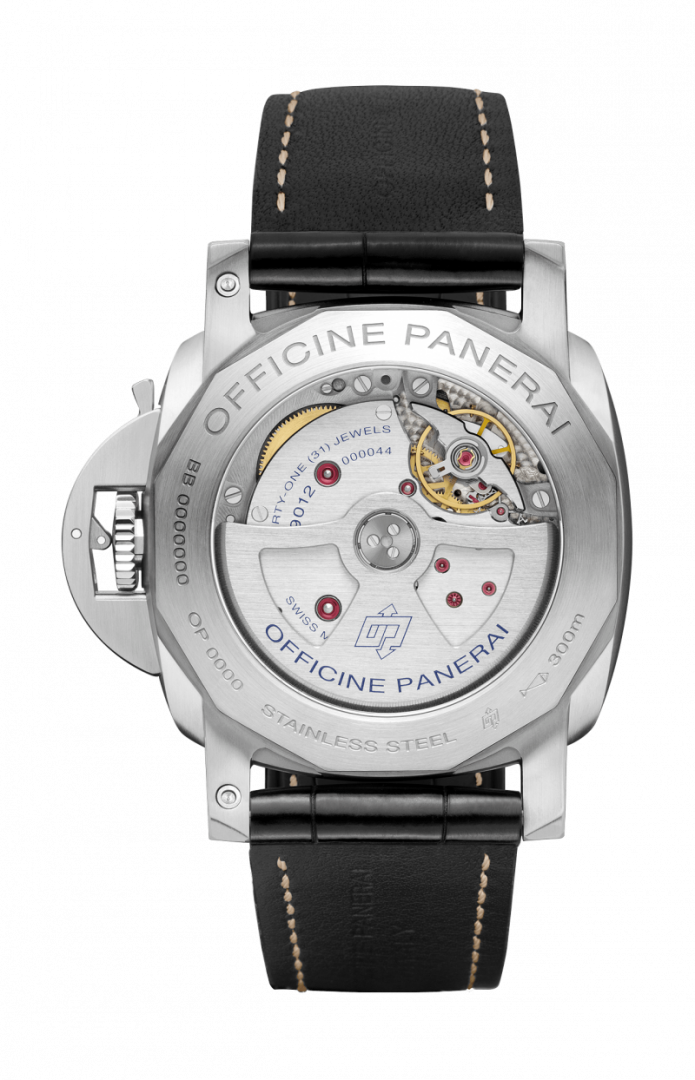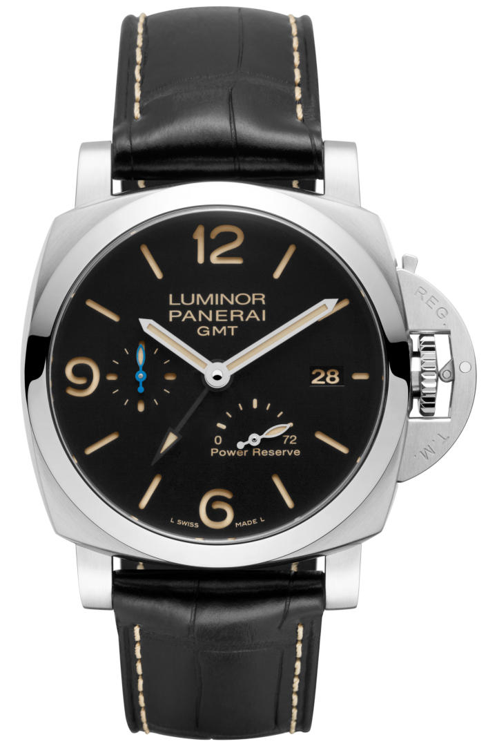 luxury watches Panerai Luminor GMT Power Reserve In-house calibre, 44 mm. The watch has functions luminescence, date , power reserve and dual time. Basic parameters of the watch are: dial colour is black, movement type is mechanical watch with automatic winding, strap material is leather and water resistance is 300 m.