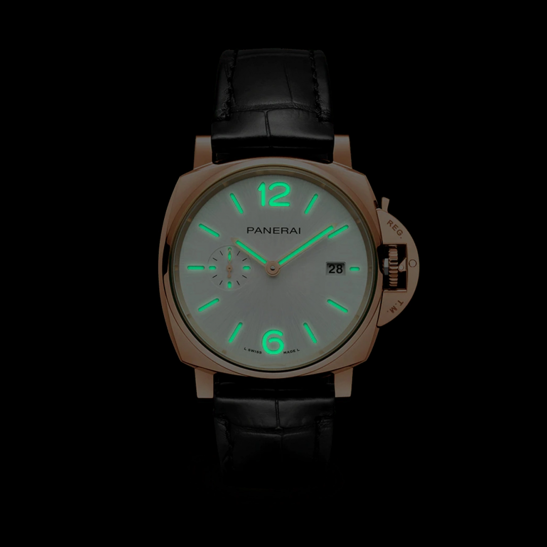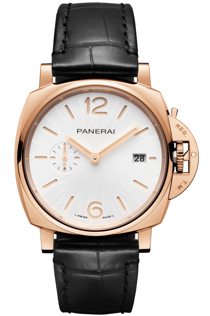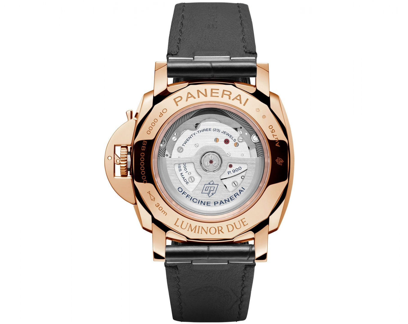 Men's luxury watches Panerai Luminor Due Goldtech™ 42mm gold case with leather strap. The watch has functions stopwatch. Basic parameters of the watch are: movement type is mechanical chronograph with automatic winding, bracelet is leather and water resistance is 50 m.