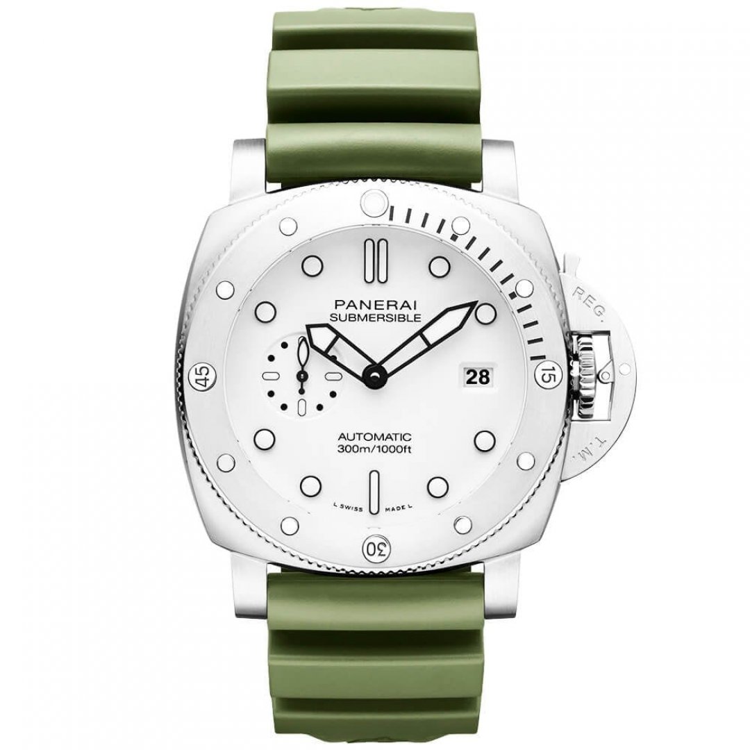 luxury watches Panerai Submersible QUARANTA QUATTRO BIANCO In-house calibre, Water resistance 300M, 44 mm. The watch has functions luminescence and date . Basic parameters of the watch are: dial colour is white, movement type is mechanical watch with automatic winding, strap material is rubber and water resistance is 300 m.