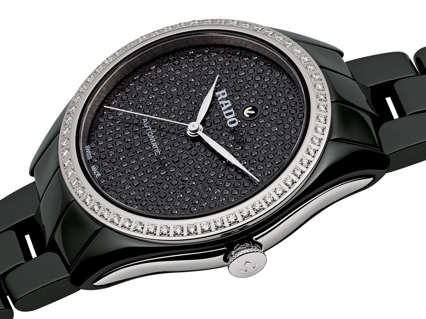 Ladies luxury watches Rado Hyperchrome Automatic Diamonds 36 mm ceramic steel case, ceramic titanium buckle. Basic parameters of the watch are: movement type is mechanical watch with automatic winding, bracelet is ceramics and titanium, water resistance is 50 m and dial colour is black.