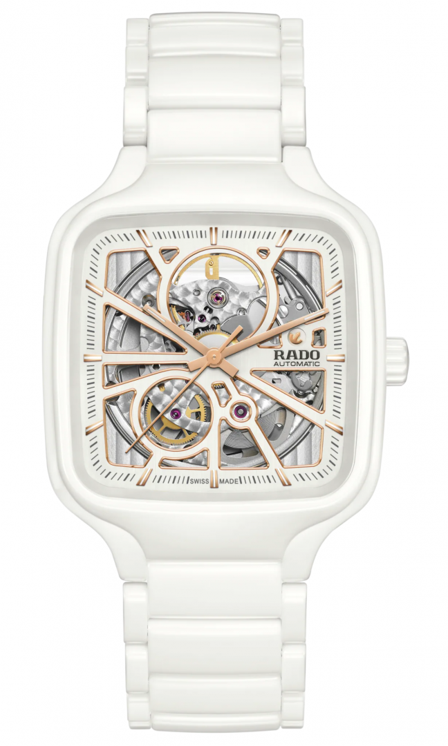 luxury watches luxury watches Rado True SQUARE AUTOMATIC OPEN HEART Automatic, 38 mm. Basic parameters of the watch are: movement type is mechanical watch with automatic winding, strap material is ceramics and titanium, water resistance is 50 m and dial colour is transparent.