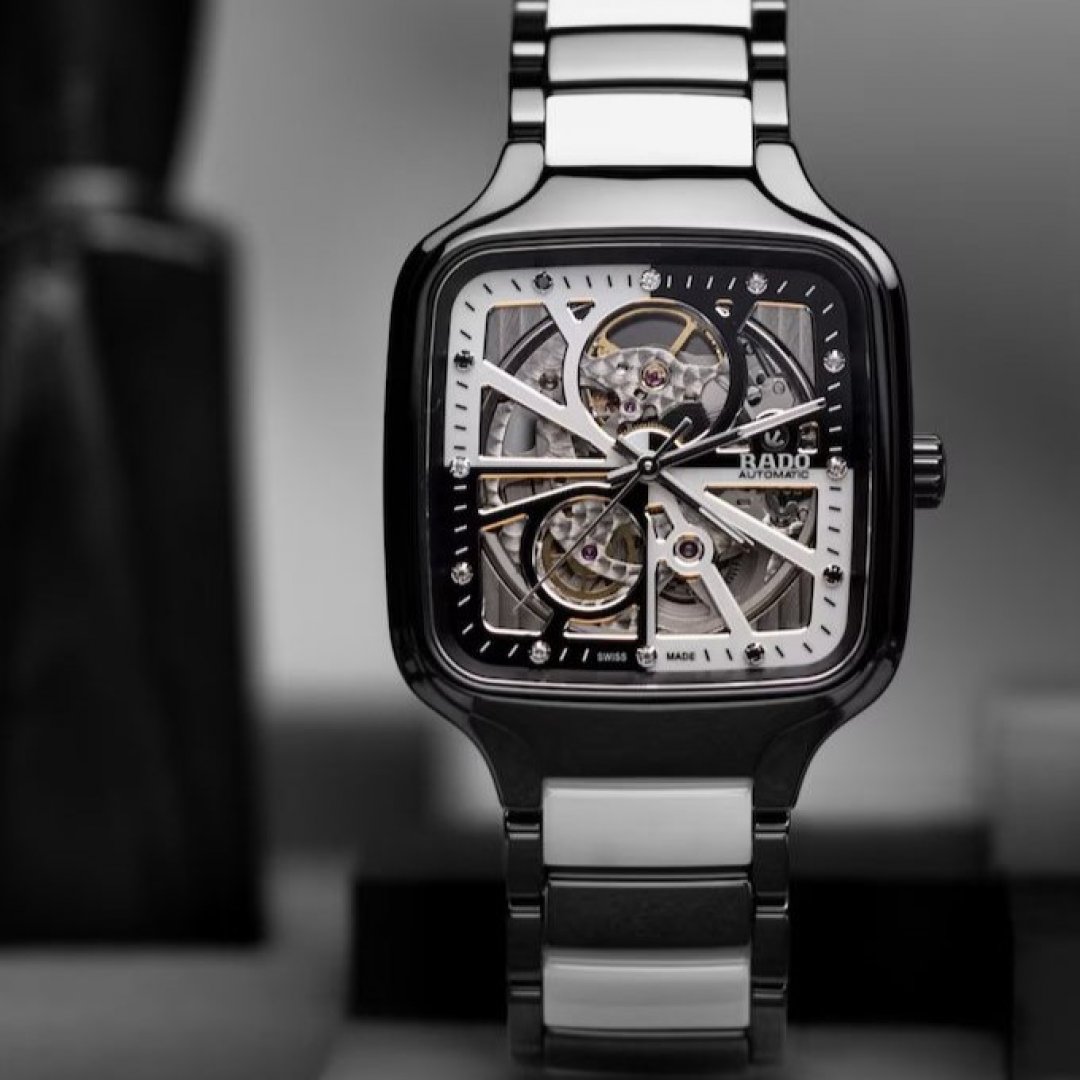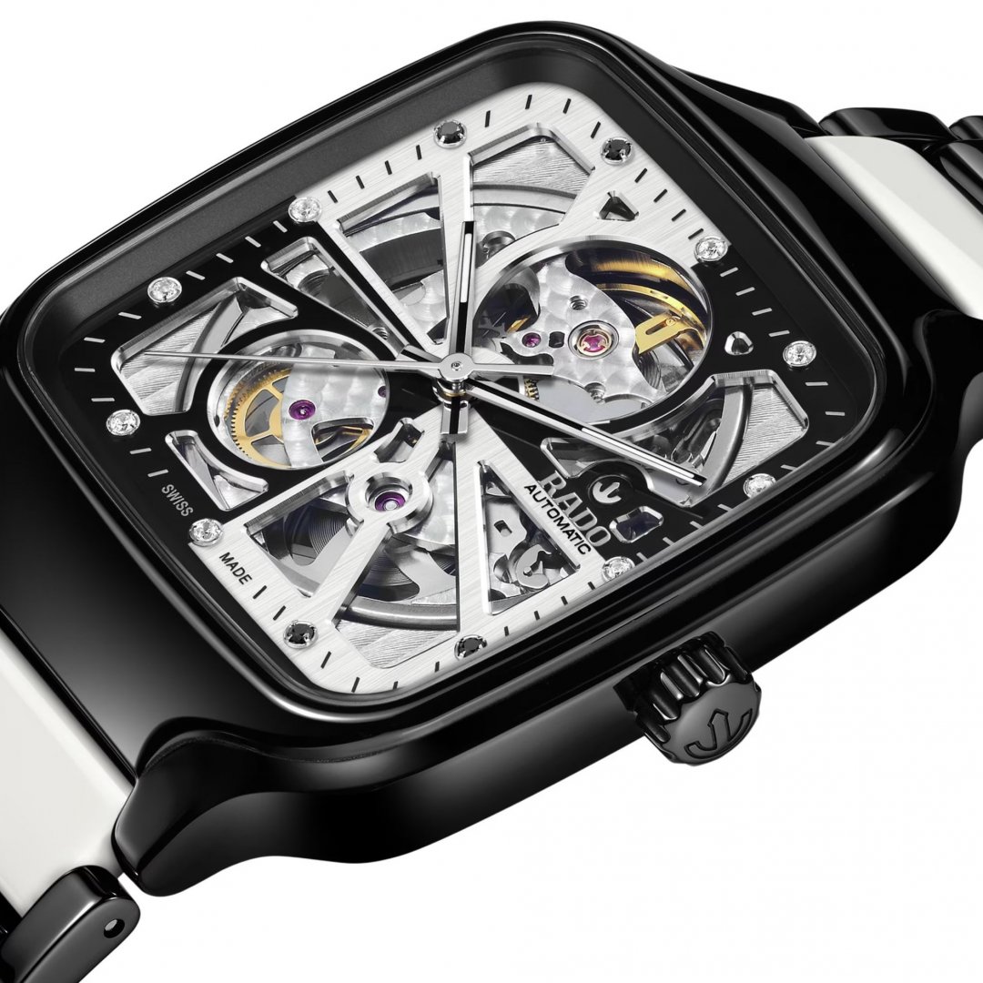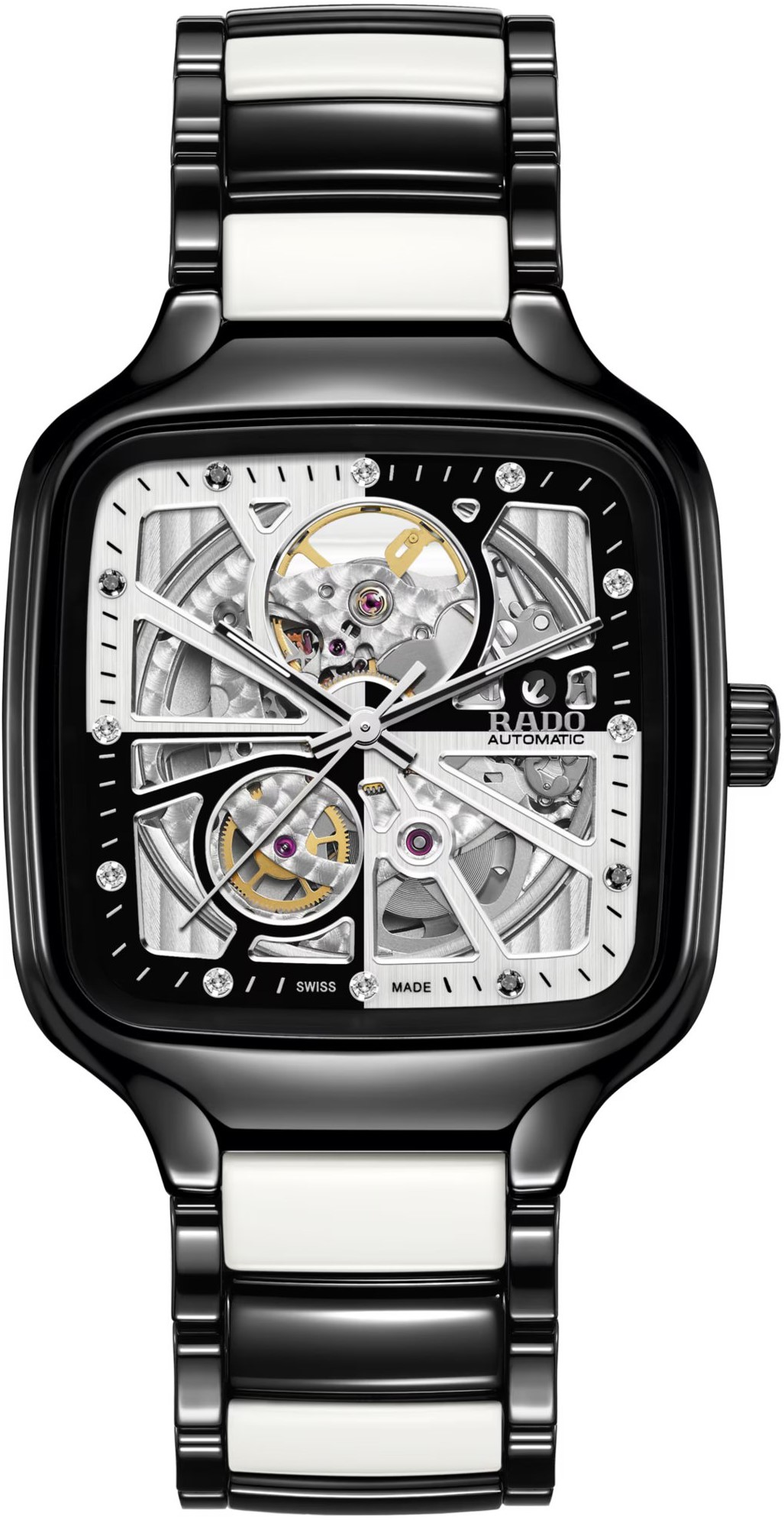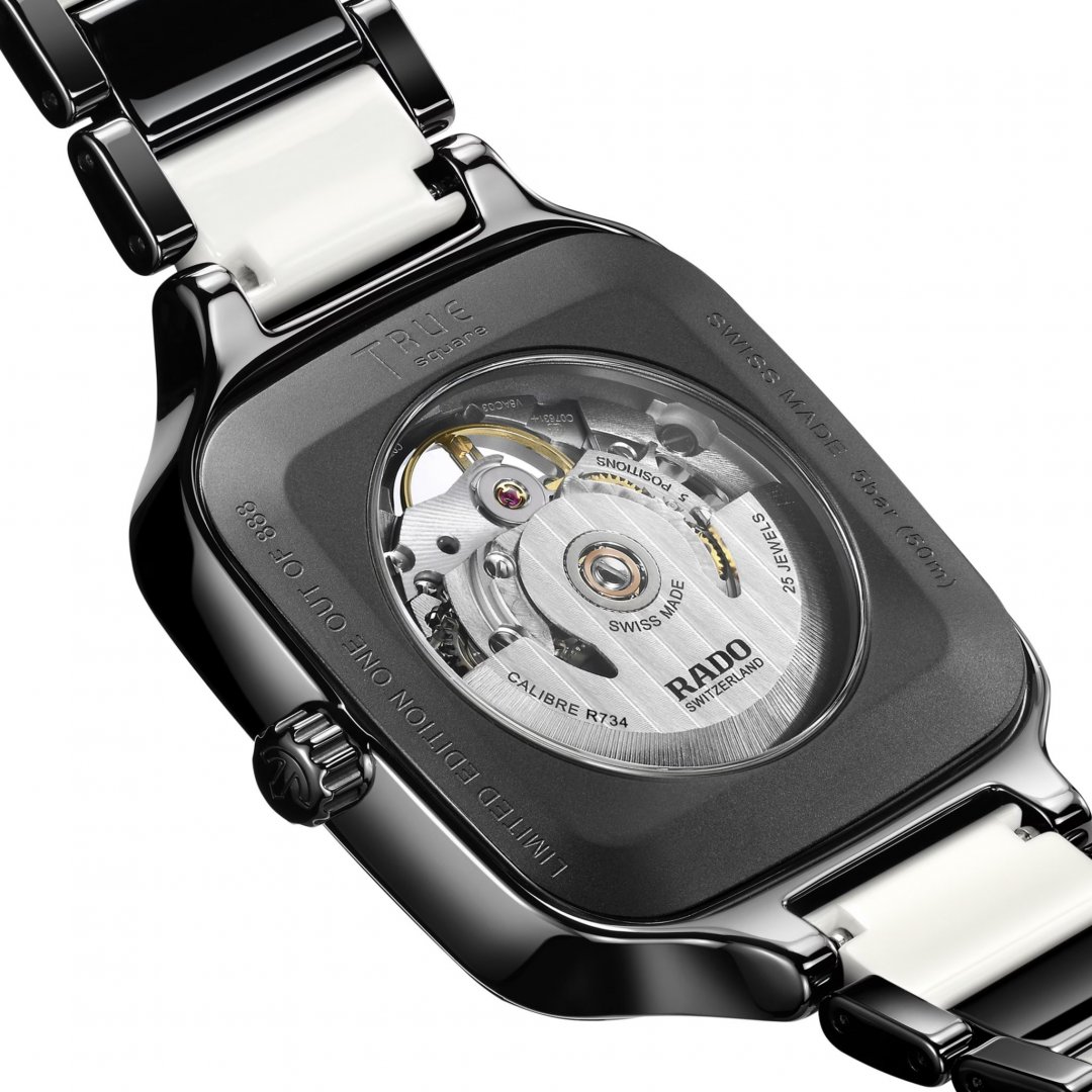 luxury watches luxury watches Rado True SQUARE AUTOMATIC OPEN HEART Diamnonds, Automatic, 38 mm. Basic parameters of the watch are: movement type is mechanical watch with automatic winding, strap material is ceramics and titanium, water resistance is 50 m and dial colour is transparent.