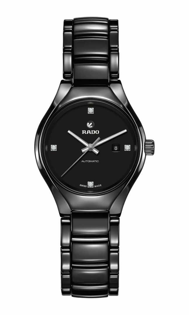 luxury watches Rado True DIAMONDS Diamonds, Automatic, 30 mm. The watch has functions date . Basic parameters of the watch are: movement type is mechanical watch with automatic winding, water resistance is 50 m, dial colour is black and strap material is ceramics.