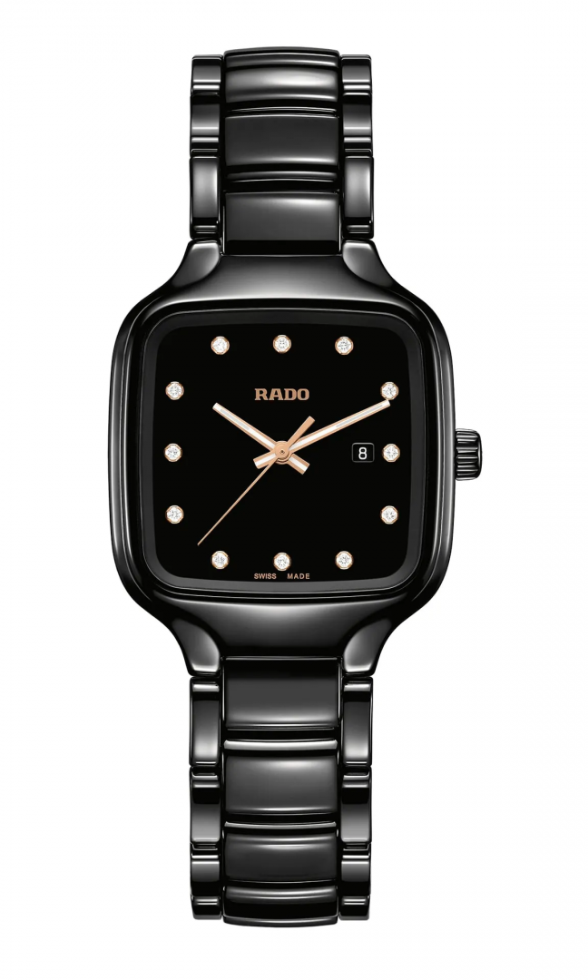 luxury watches Rado True SQUARE DIAMONDS Diamonds, Quartz, 29 mm. The watch has functions date , luminescence and E.O.L.. Basic parameters of the watch are: water resistance is 50 m, movement type is Quartz watches, dial colour is black and strap material is ceramics.