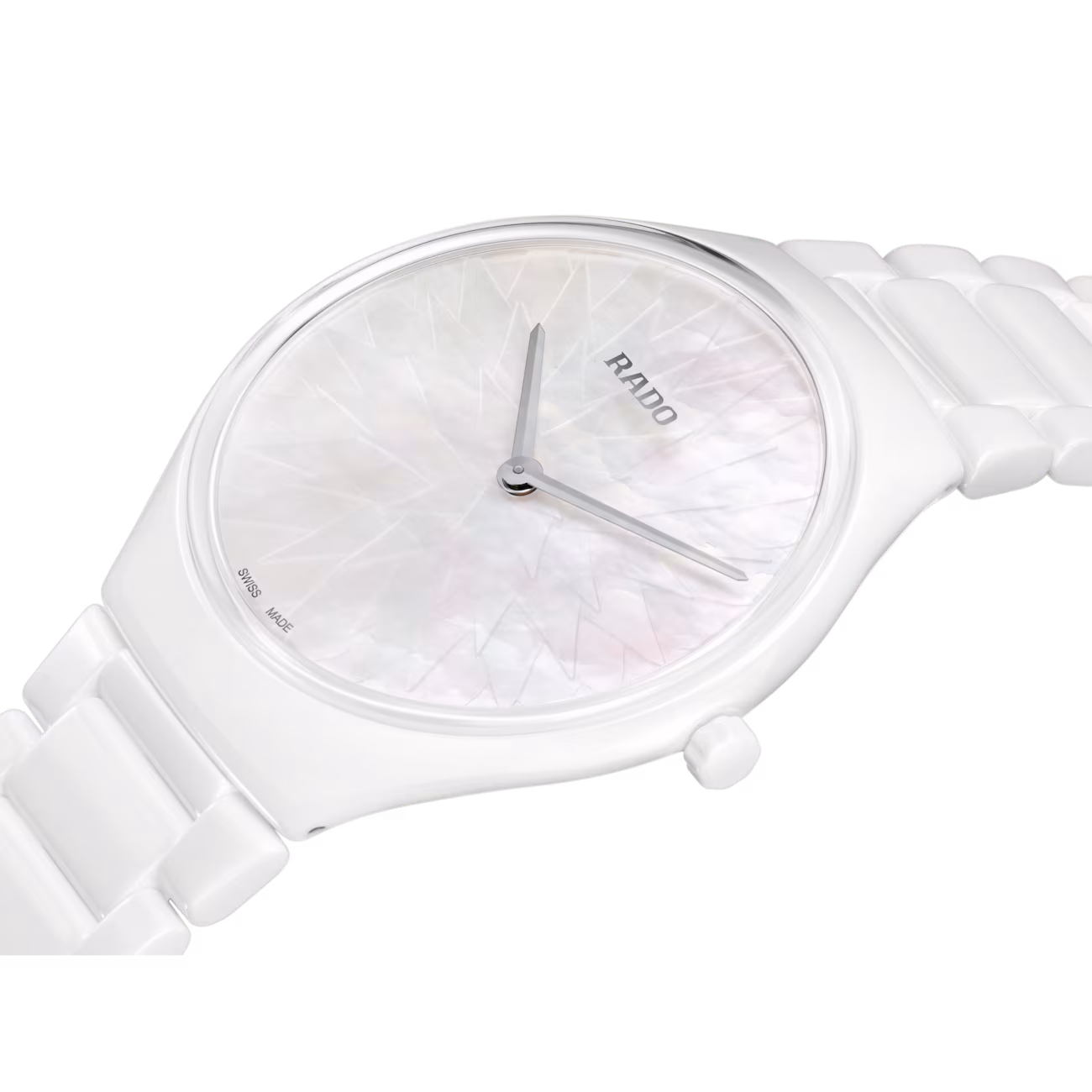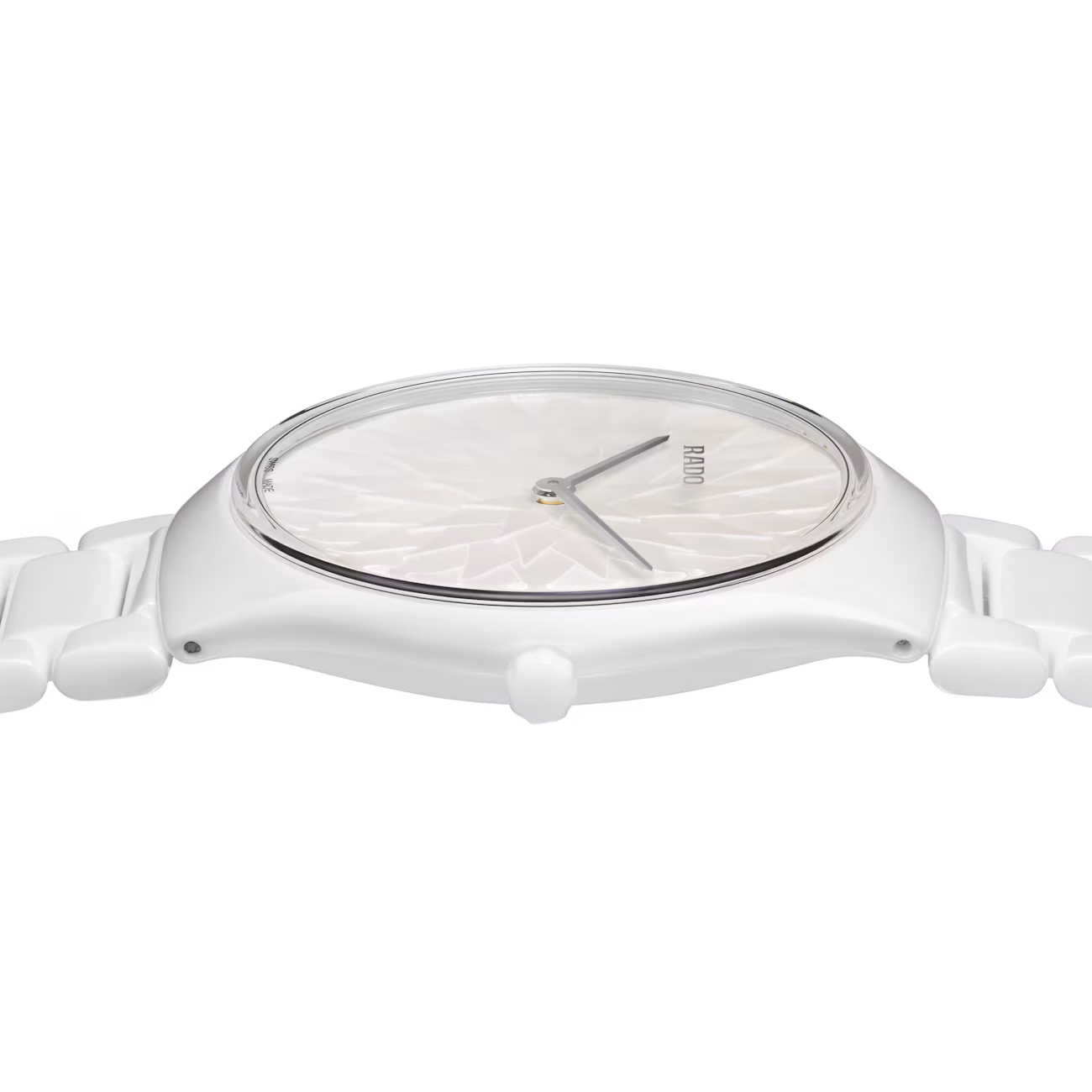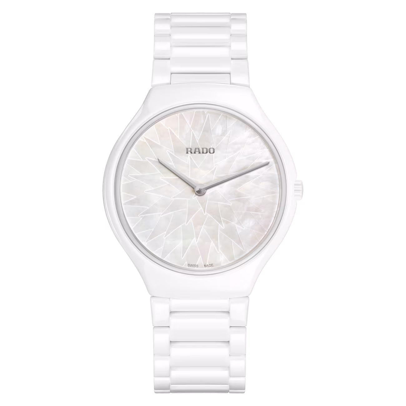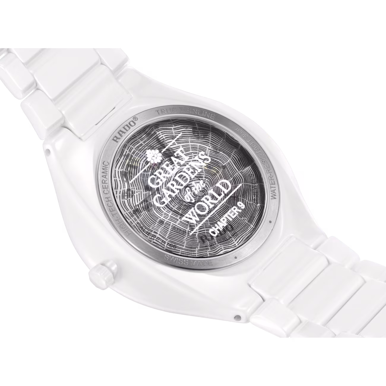 The True Thinline x Great Gardens of the World Chapter 9 (Araucaria) with it’s white high-tech ceramic case offers a different mood — airy, peaceful and unique, enhanced by a white mother-of-pearl dial engraved to recall the fresh, almost playful leaf outlines of the rare Chilean tree. The smooth surface of high-tech ceramic — particularly sensuous and palpable in white, are a clever contrast to the pointed extremities of the tree leaves, especially against the cool, radiant mother-of-pearl. The watch uses the premium Rado R766 movement, providing a generous power reserve of 72 hours. It’s equipped with a Nivachron™ anti-magnetic hairspring, for highly reliable precision. Chapters 8, 9 and 10 of this new Rado "Great Gardens of the World" product line are available individually or as a trio in a special collector's display-box edition, limited to 99 units.