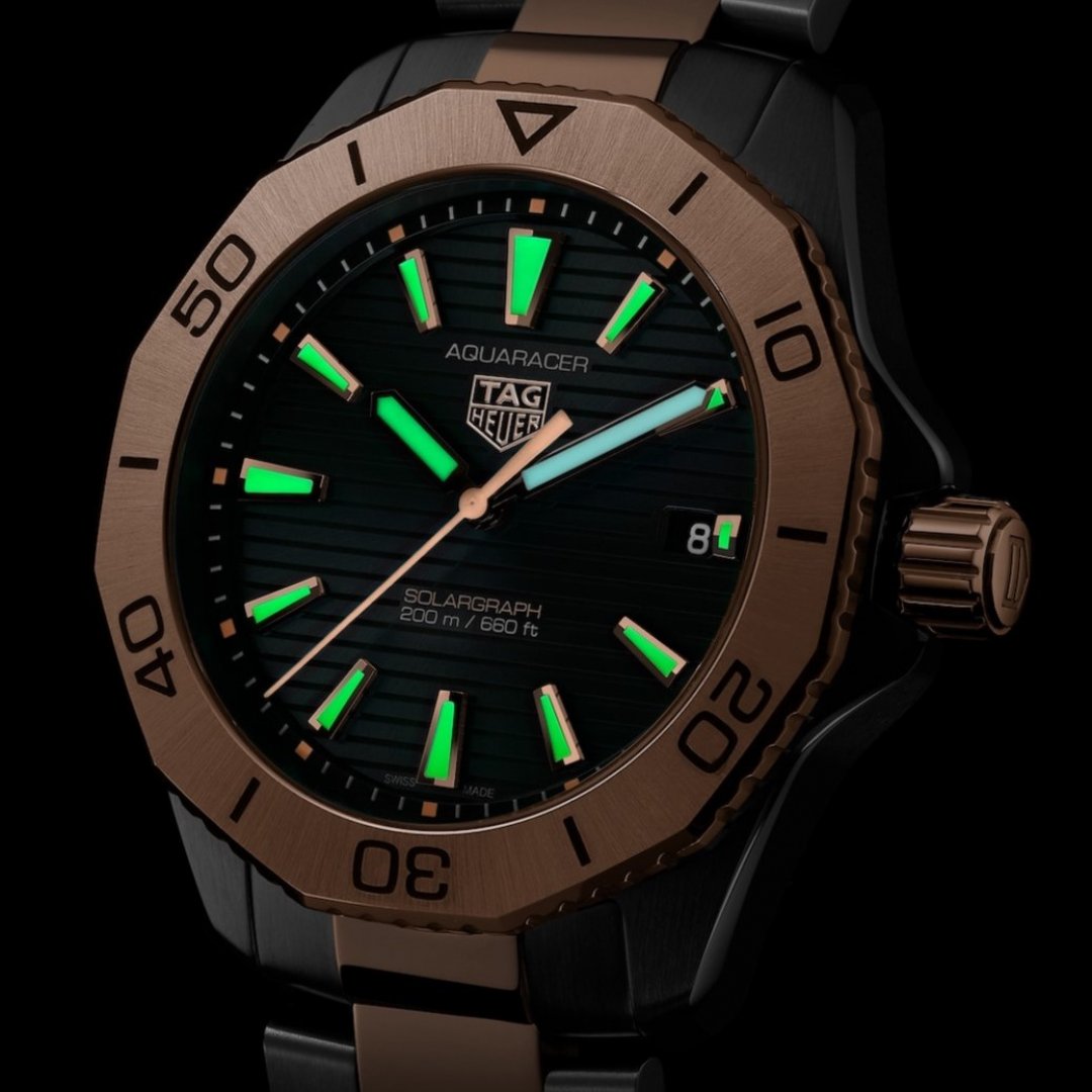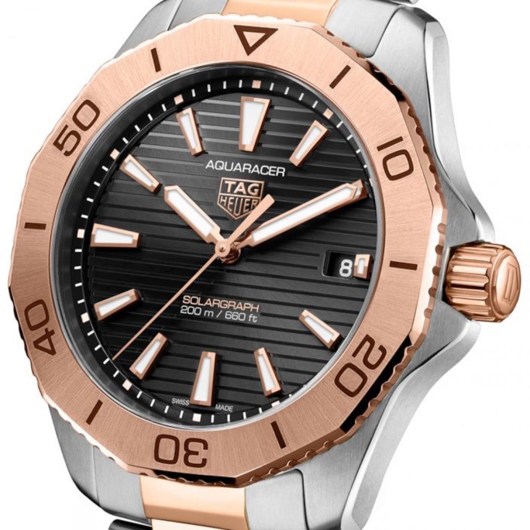 luxury watches TAG Heuer Aquaracer PROFESSIONAL 200 SOLARGRAPH Solar, Water resistance 200M, 40 mm. The watch has functions luminescence and date . Basic parameters of the watch are: movement type is Quartz watches, water resistance is 200 m, strap material is steel and gold and dial colour is black.