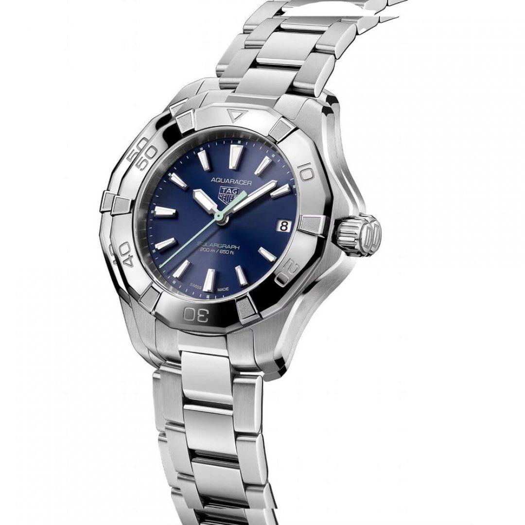 luxury watches TAG Heuer Aquaracer Solargraph Quartz, Water resistance 200M, 34 mm. The watch has functions luminescence, date and E.O.L.. Basic parameters of the watch are: movement type is Quartz watches, strap material is steel, water resistance is 200 m and dial colour is blue.