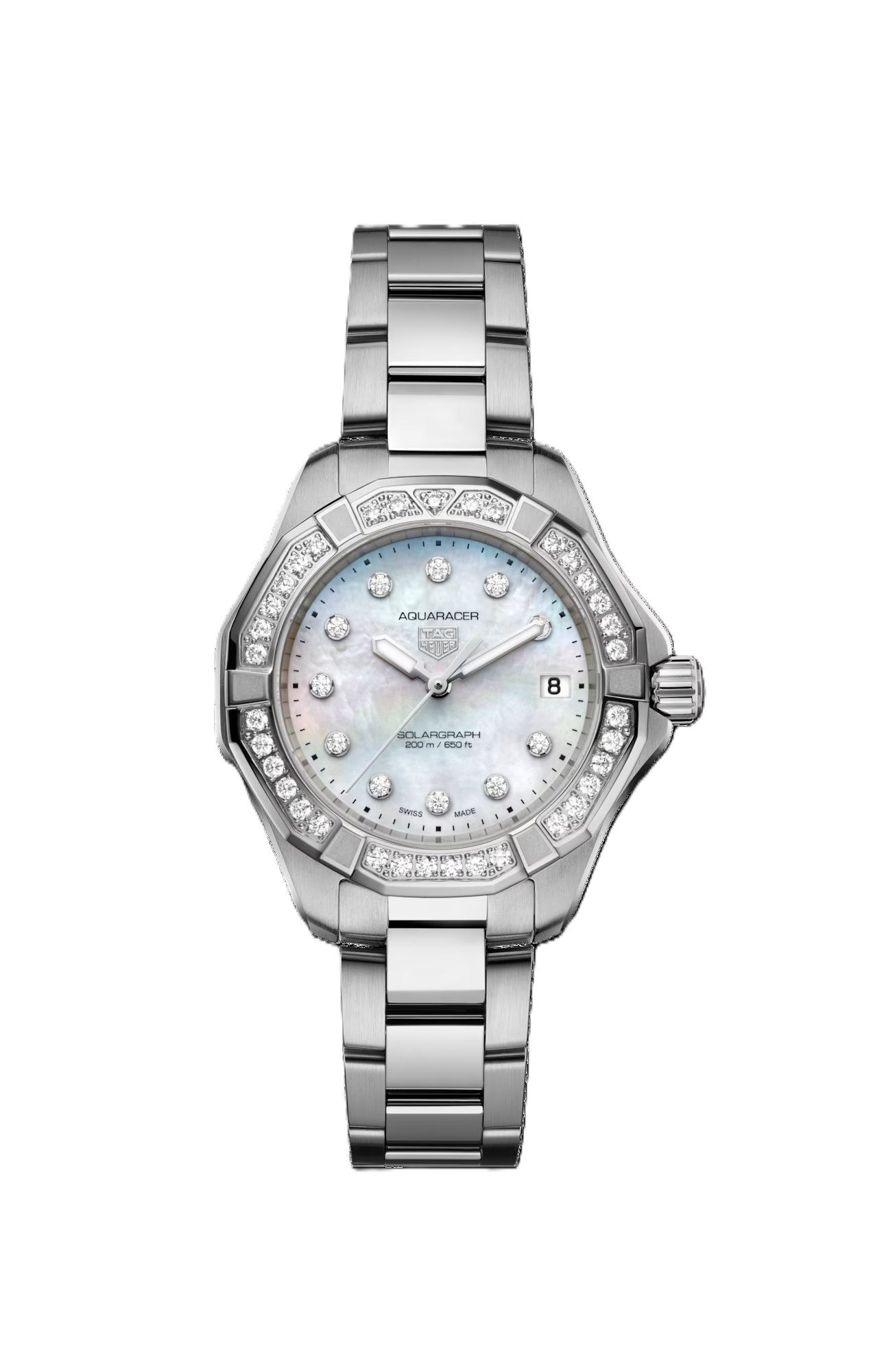 Thirty-five glistening diamonds (0.6cts) set on the bezel and eleven diamonds (0.15cts) on the radiant mother-of-pearl dial elevate this 34mm TAG Heuer Aquaracer. Meticulously crafted in steel, it combines enduring resilience with unparalleled sophistication, ready to face any challenge with sheer elegance.