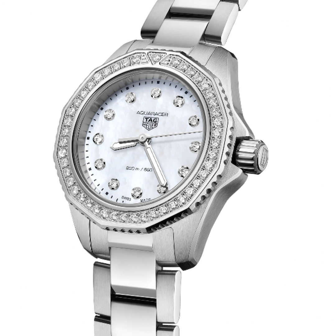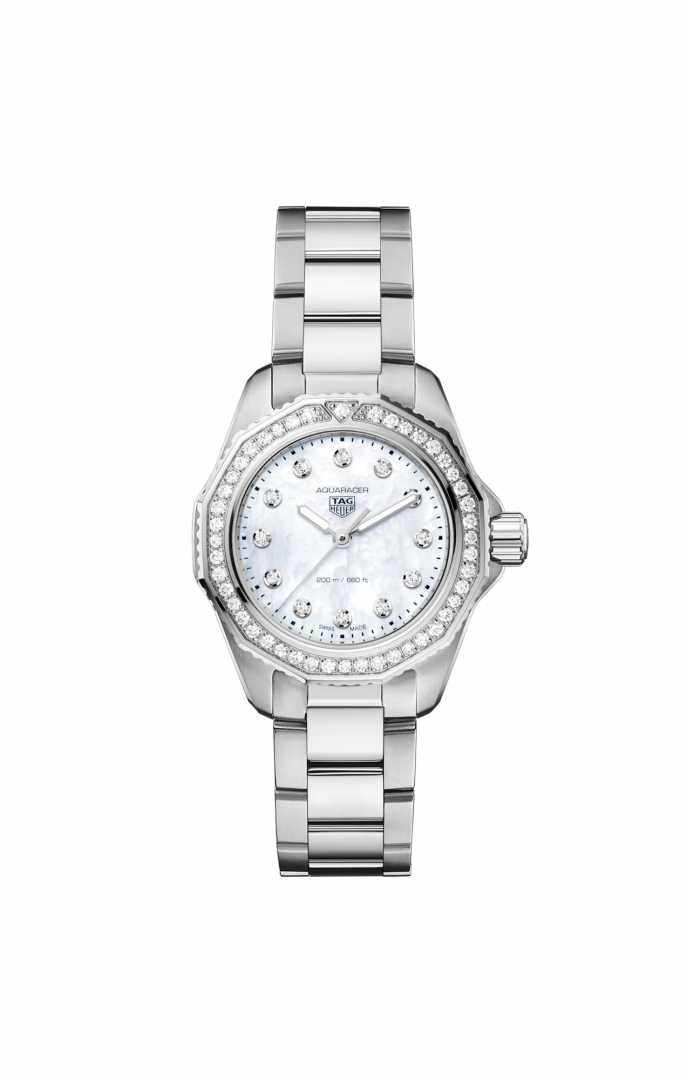 luxury watches TAG Heuer Aquaracer PROFESSIONAL 200 Diamonds, Quartz, Water resist 200M, 30 mm. The watch has functions luminescence. Basic parameters of the watch are: dial colour is pearl, movement type is Quartz watches, strap material is steel and water resistance is 200 m.