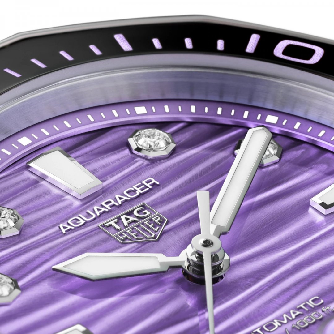 luxury watches TAG Heuer Aquaracer PROFESSIONAL 300 Diamonds, Automatic, 36 mm. The watch has functions luminescence and date . Basic parameters of the watch are: movement type is mechanical watch with automatic winding, water resistance is 300 m, strap material is steel and dial colour is purple.