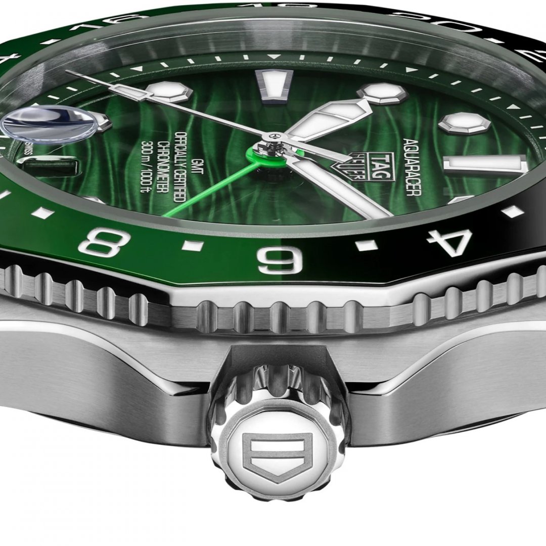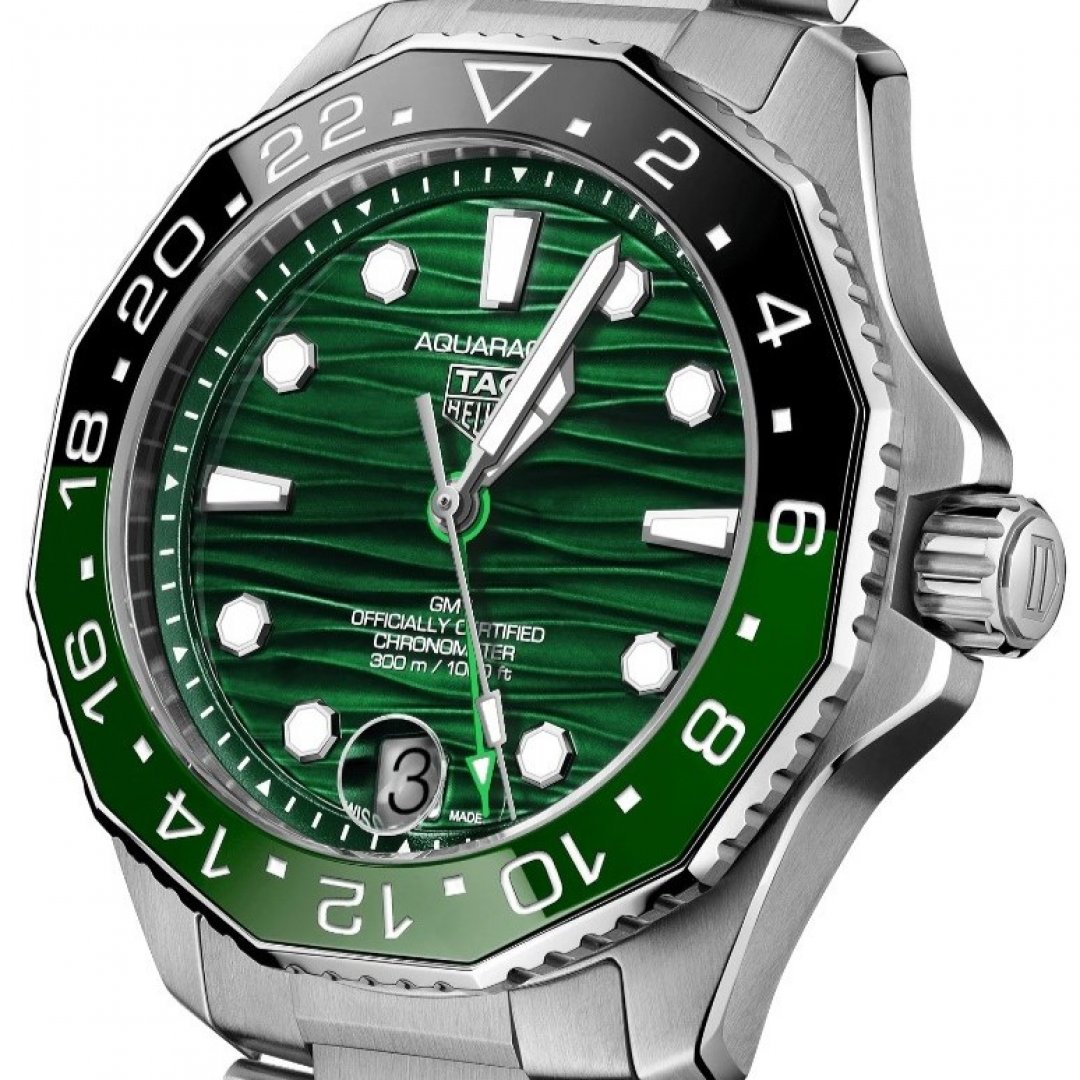 luxury watches TAG Heuer Aquaracer PROFESSIONAL 300 GMT Water resistance 300 m, twin-timezone, 42 mm. The watch has functions luminescence, date and dual time. Basic parameters of the watch are: movement type is mechanical watch with automatic winding, water resistance is 300 m, strap material is steel and dial colour is green.