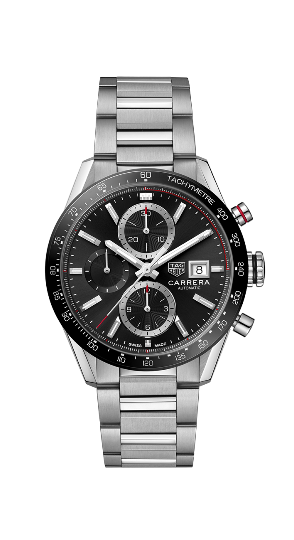 Luxury watches TAG Heuer Carrera . The watch has functions luminescence, stopwatch, Tachymeter scale and date . Basic parameters of the watch are: movement type is mechanical chronograph with automatic winding, water resistent is 100 m, dial colour is black and strap material is steel.