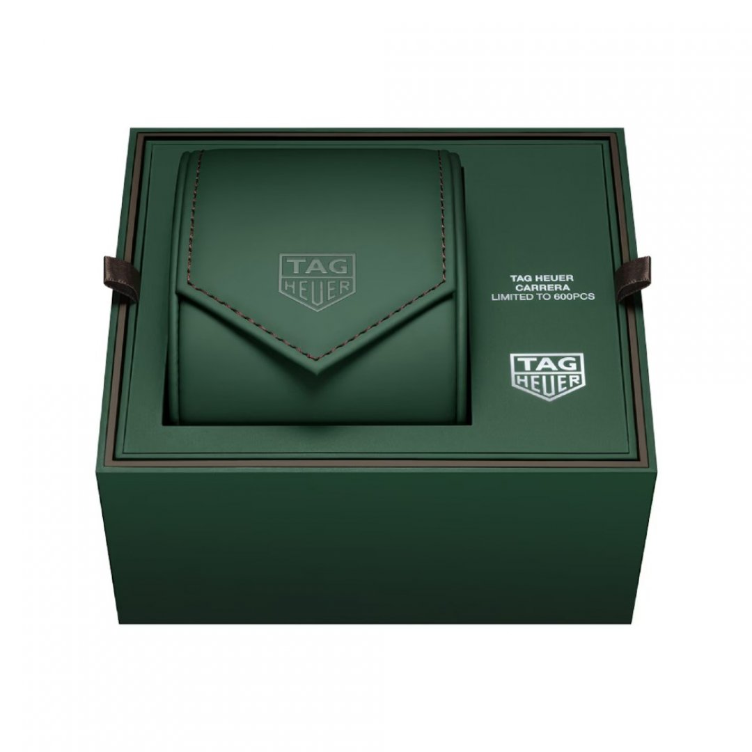 luxury watches TAG Heuer Carrera Limited edition 600pcs HEUER 02, Water resistance 100M, 42 mm. The watch has functions luminescence, stopwatch and date . Basic parameters of the watch are: movement type is mechanical chronograph with automatic winding, water resistance is 100 m, strap material is leather and dial colour is brown and green.